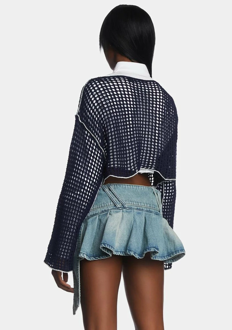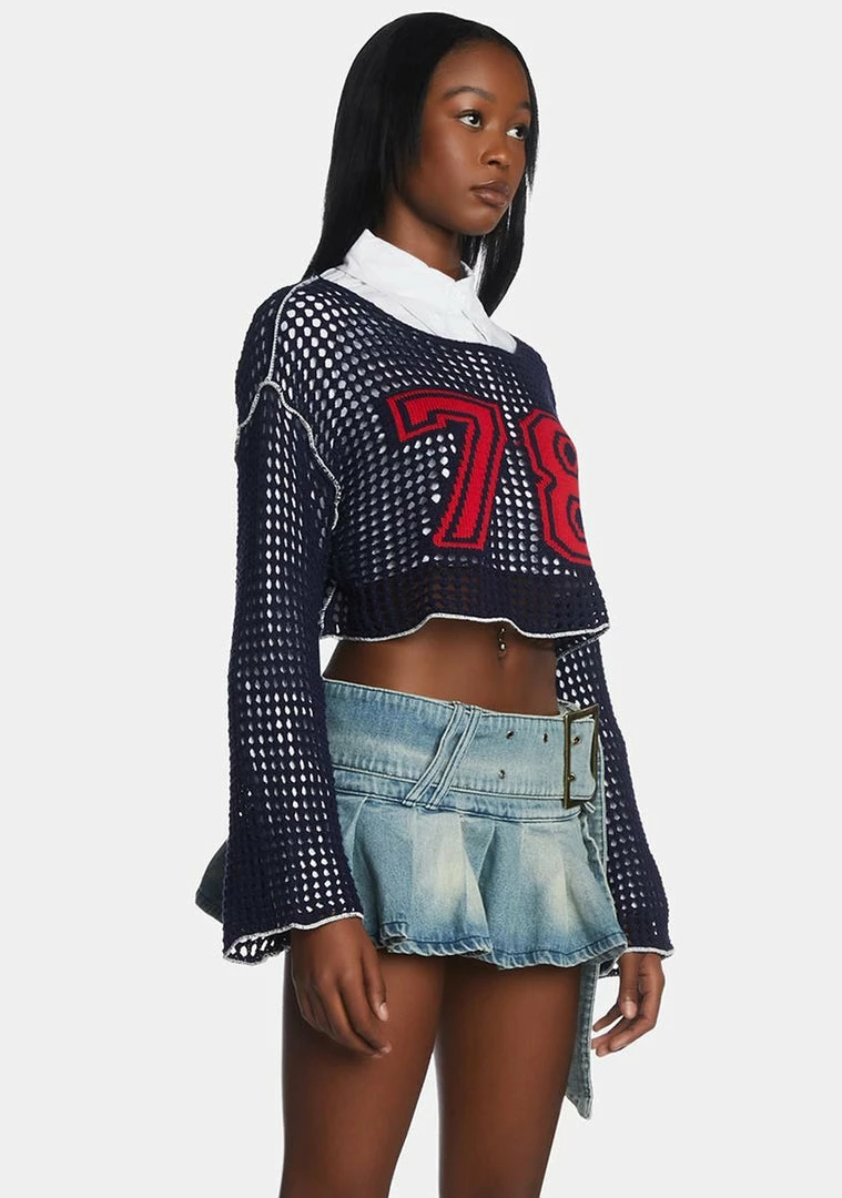 cuz you’re always on the go. This crop sweater has an open knit construction, contrast stitching, varsity style patch graphics on the front, and long flared sleeves.