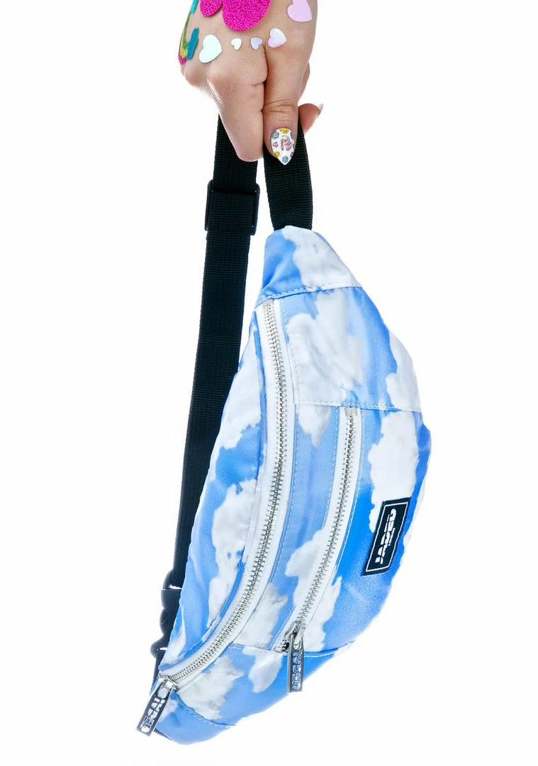 cuz ya always bring us sunshine on a cloudy day, bb! This dope fanny pack features a suuuper sleek รขยยn smooth sky blue cloud print construction, front zip pocket, top zip closure for tha main compartment, and an adjustable black woven waist strap with utility clip closure.