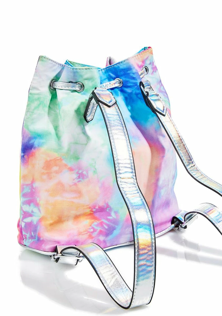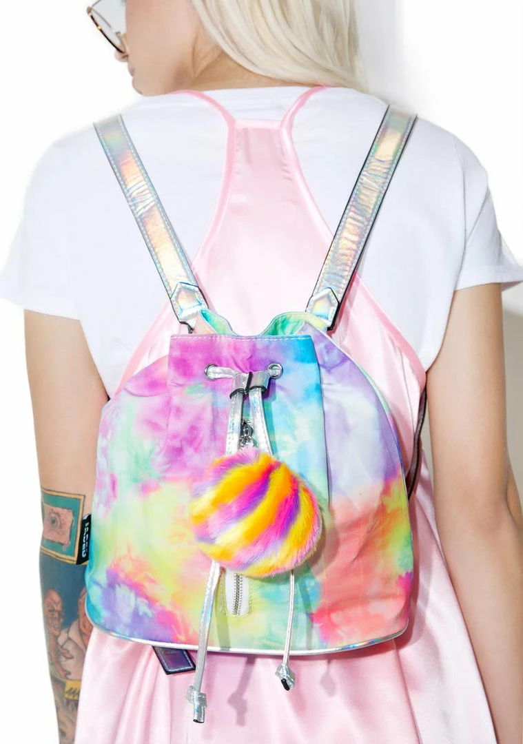 wants to cheer ya on, bb. This super cute backpack features a satin shell with a rainbow tie dye design and a colorful pom accent. Fully lined, this bb has padded adjustable straps, drawstring top with a press stud closure.