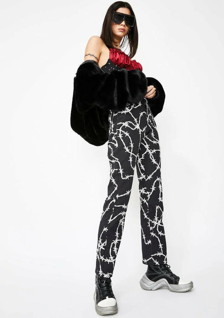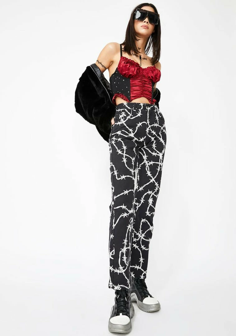 cuz you take no prisoners, babe. Go past the danger zone in these sikk AF denim jeans that have a high waist fit, front Nรขยย back pockets, and a bada$$ barbed wire print all ova.