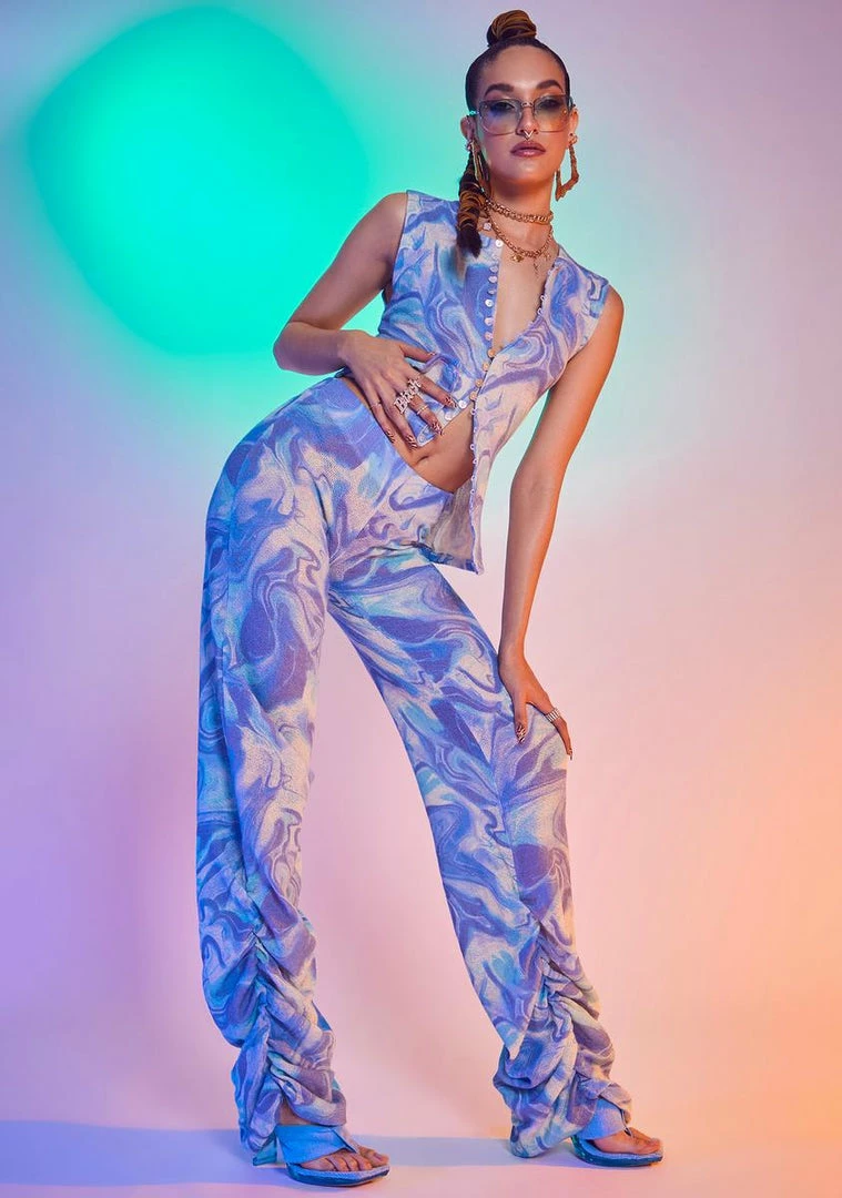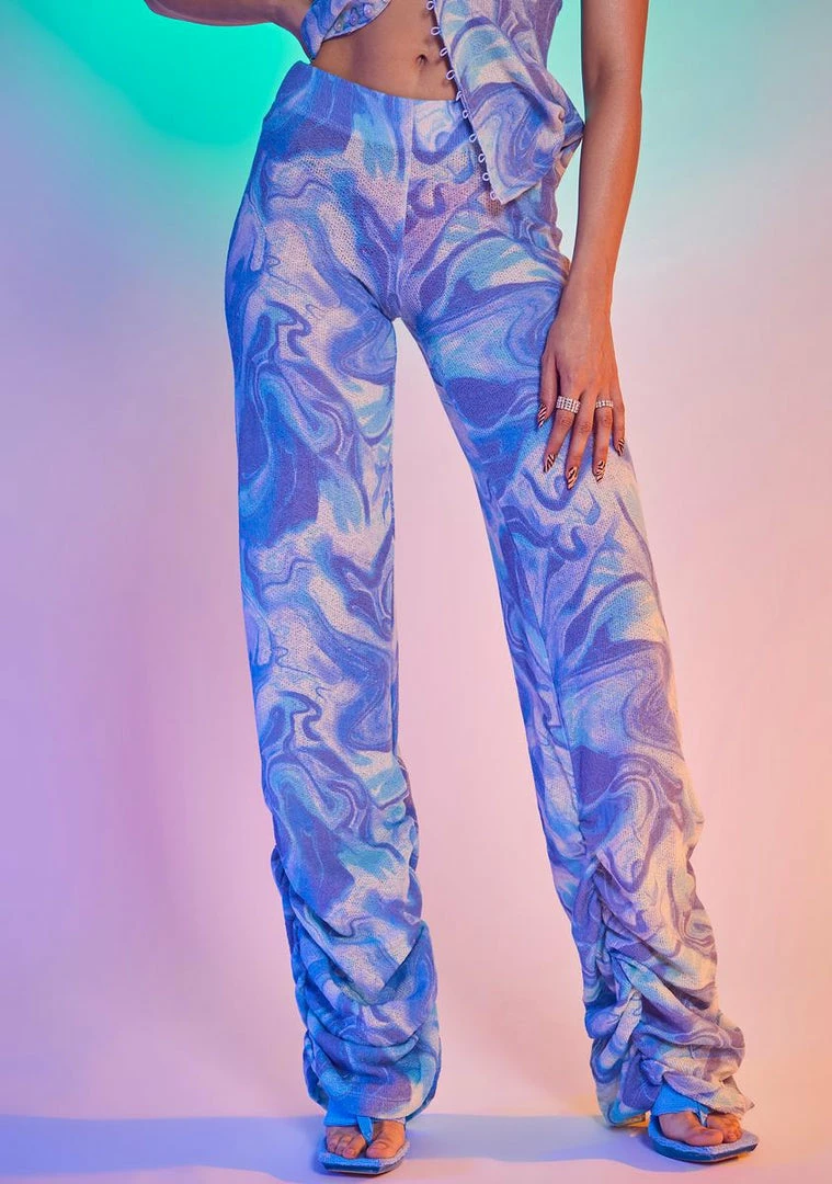 give รขยยem psychedelic sass! These wide leg knit joggers have an elastic waistband, ruched hems, and a tonal marble print all over.