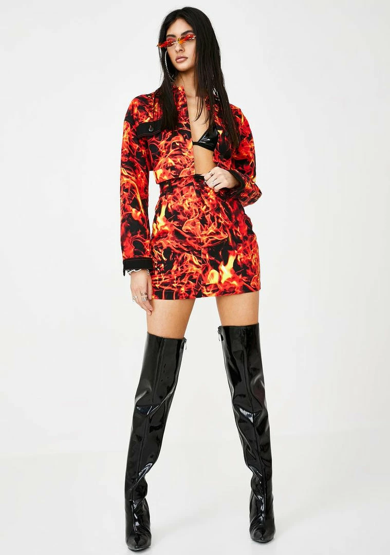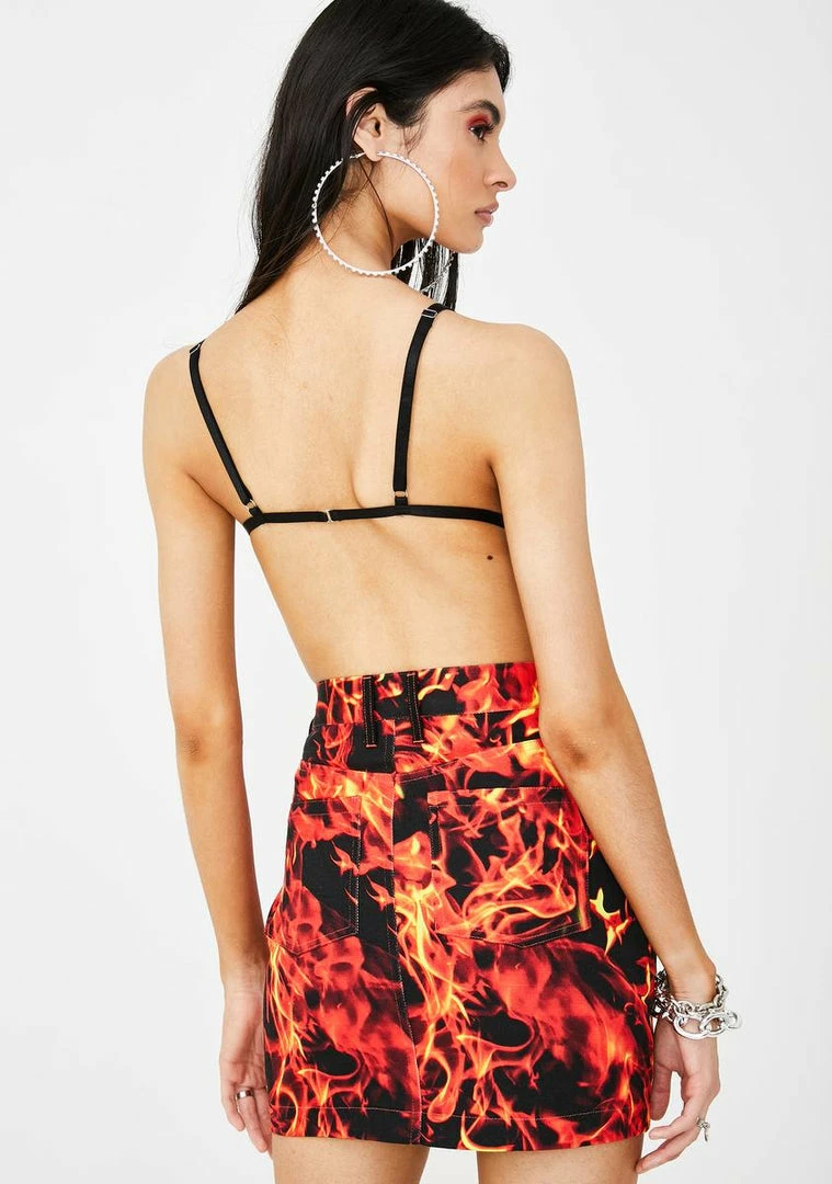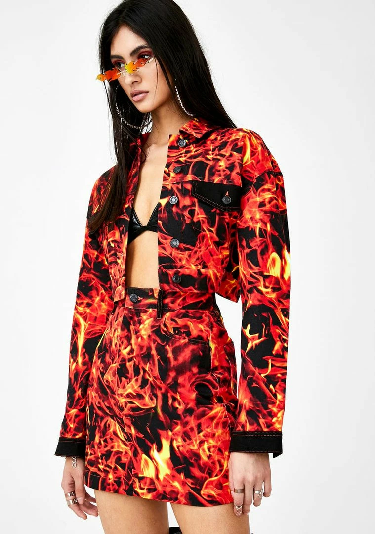 will have ya raising hell, babe! Tell รขยยem not to get too close supa hott denim skirt that has a high waist fit, front Nรขยย back pockets and a fire print all ova.