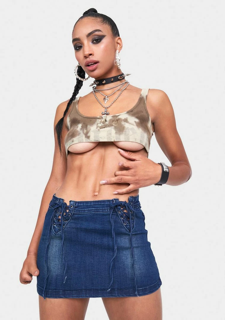 will give รขยยem y2k fever! This denim mini skirt has a low waistline, a stretchy bodycon fit, and lace-up details on the front.