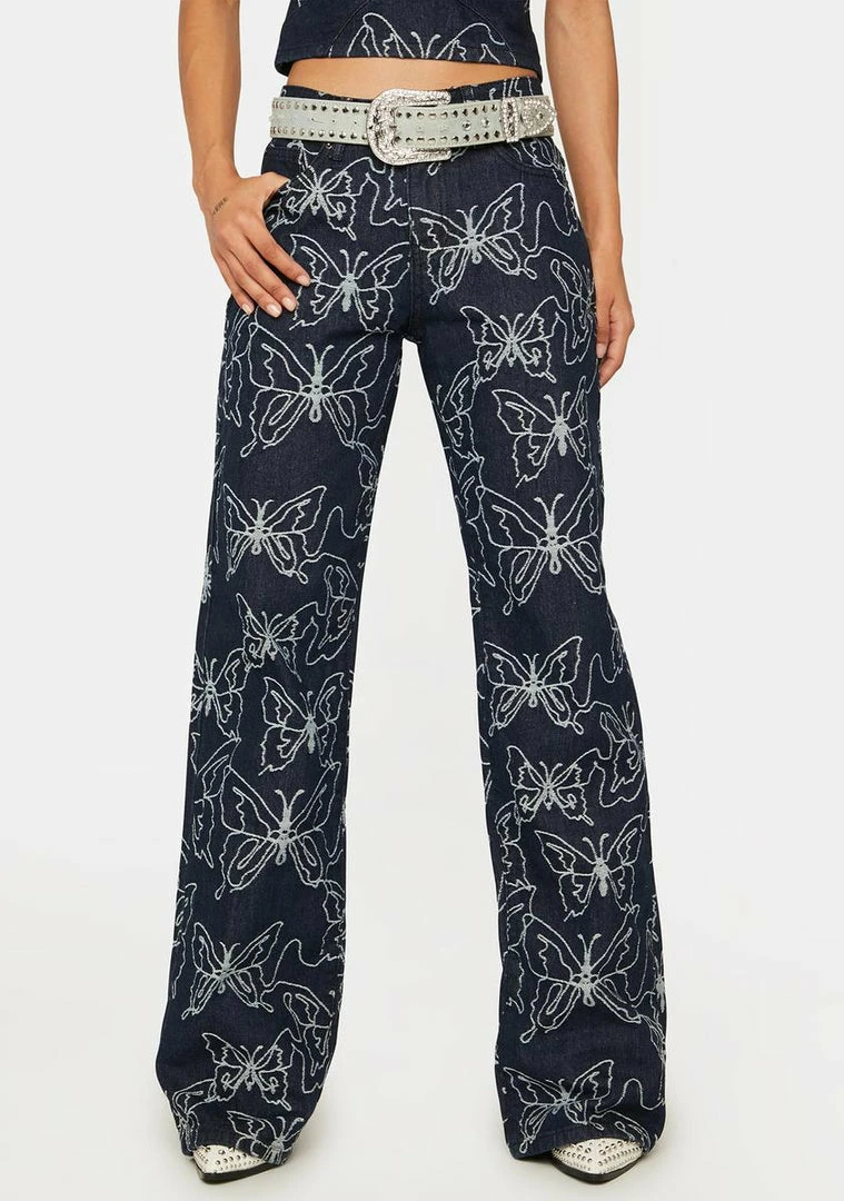 will give you more than fifteen minutes of fame! These low rise denim jeans have baggy wide legs, pockets on the front and back, and a butterfly print all over.