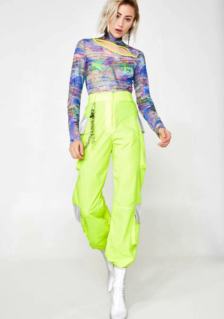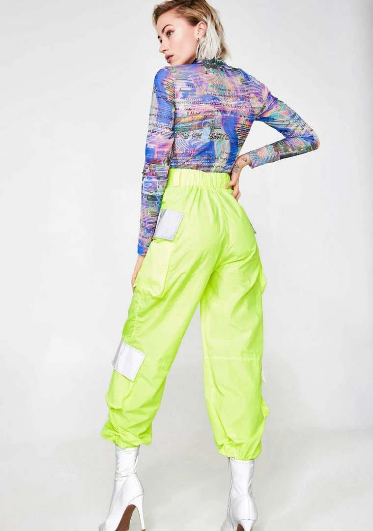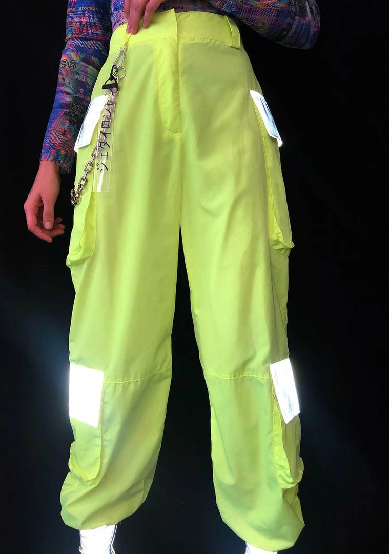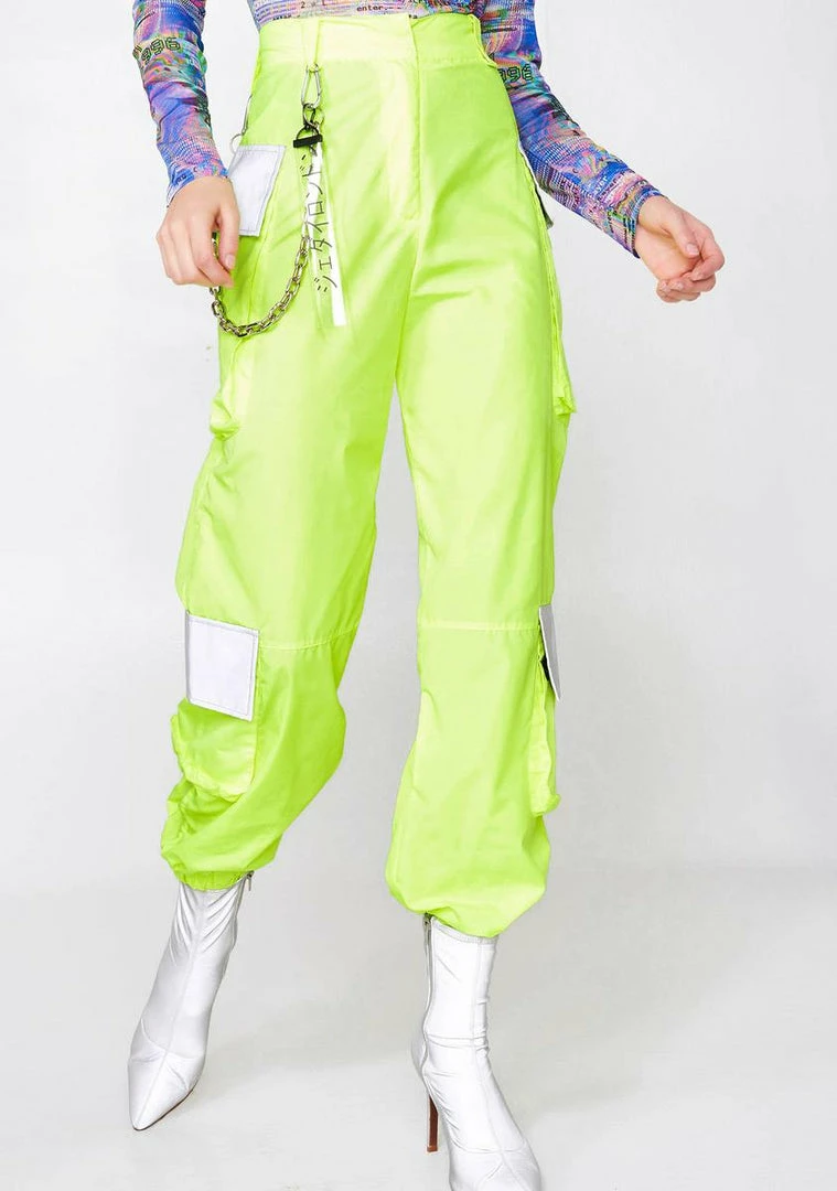 cuz youΓ’ΒΒre a radioactive baddie bae! No one can dull your shine in these supa bright parachute pants that have cargo pockets with reflective flaps, a sikk side chain detail, a zip fly NΓ’ΒΒ hook closure, and an elastic back waistband NΓ’ΒΒ cuffs.