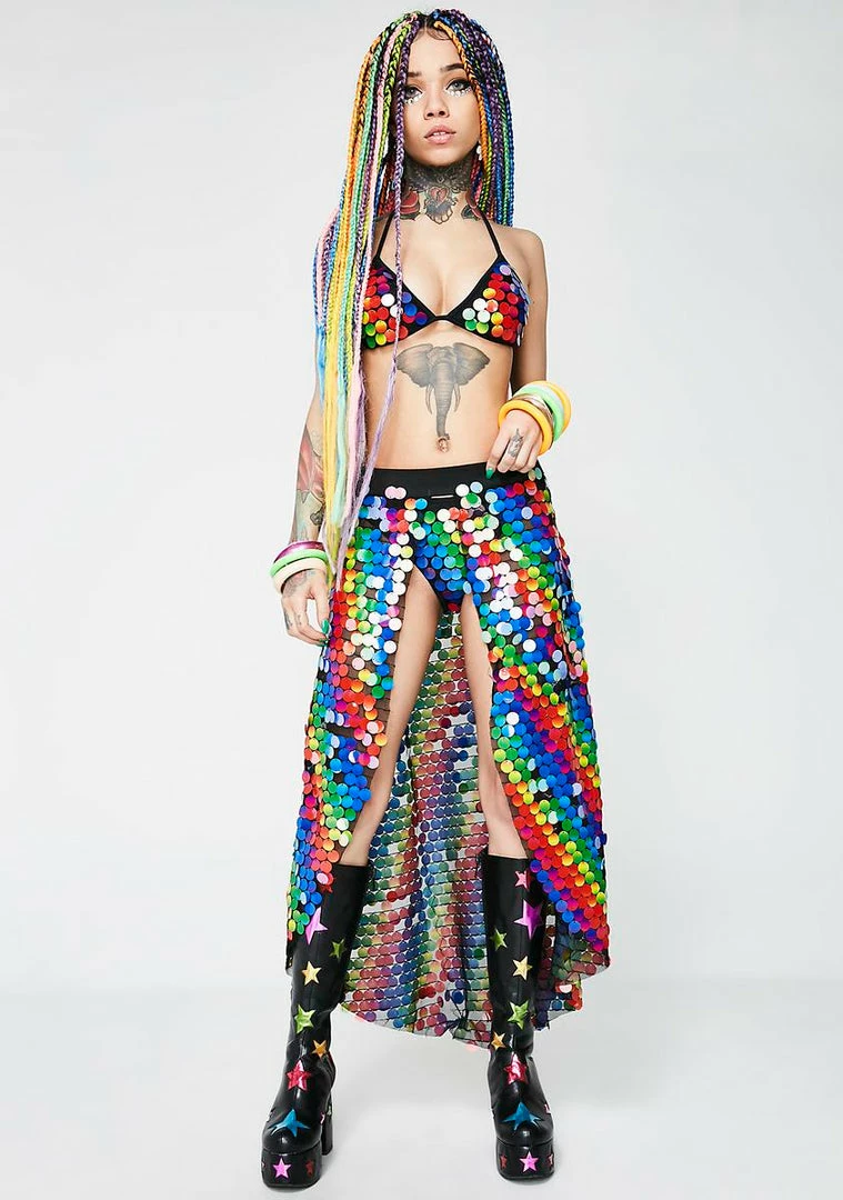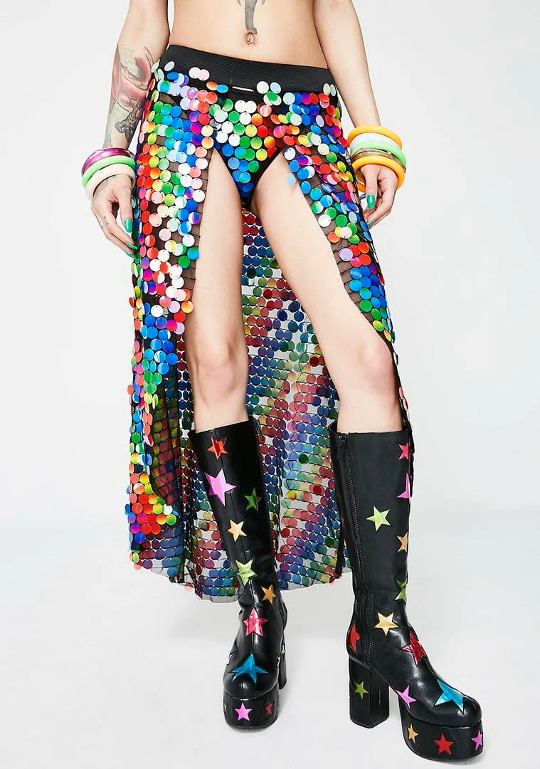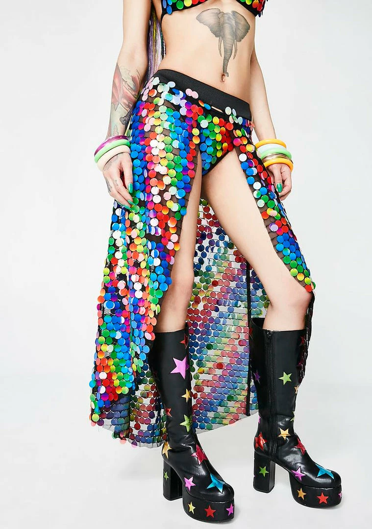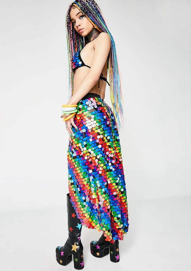 got ya shininΓ’ΒΒ on the shore. This skirt has an elastic waistband, an open front, a high low design, and is covered with rainbow sequins.