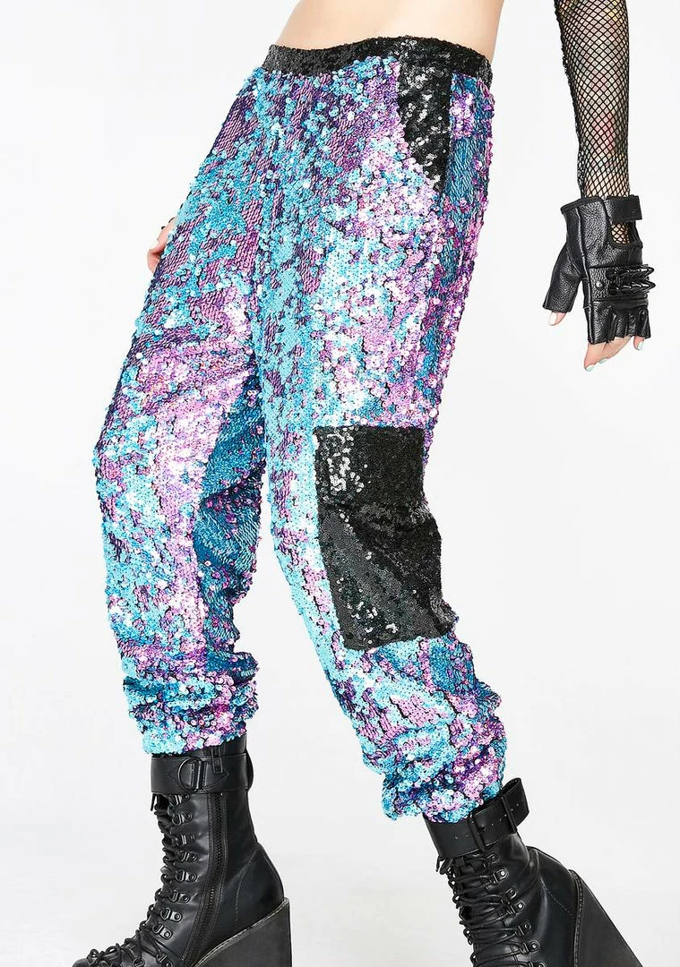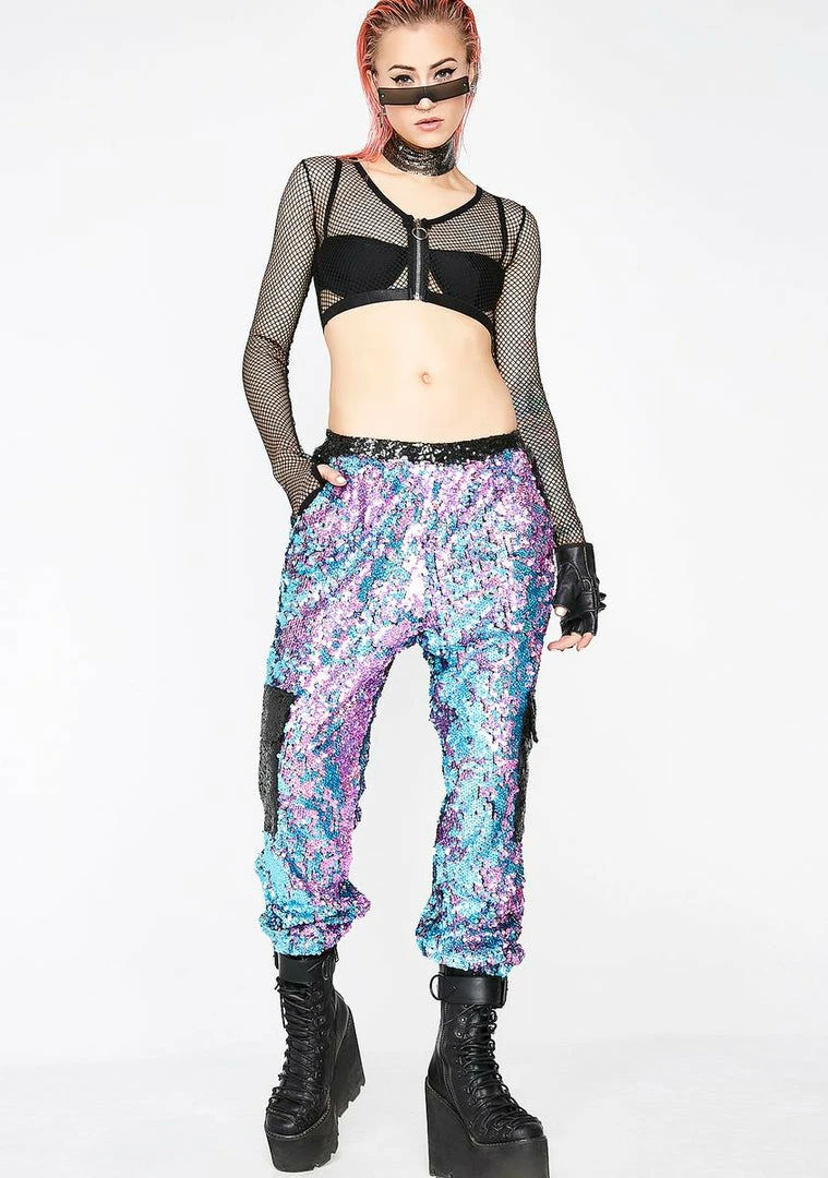 cuz youΓ’ΒΒre ready to glam it up. Shimmer everywhere you go with these high waisted cargo pants that have a sikk sequin detail all ova and cargo pockets on the sides.