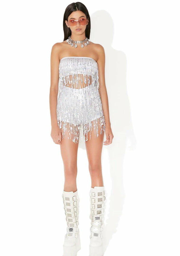 shake it, baby, shake it! Get yer fringe a-flyinΓ’ΒΒ in these sikk af booty shorts featuring a stretchy metallic silver construction, high waist fit and holographic silver sequin fringe.