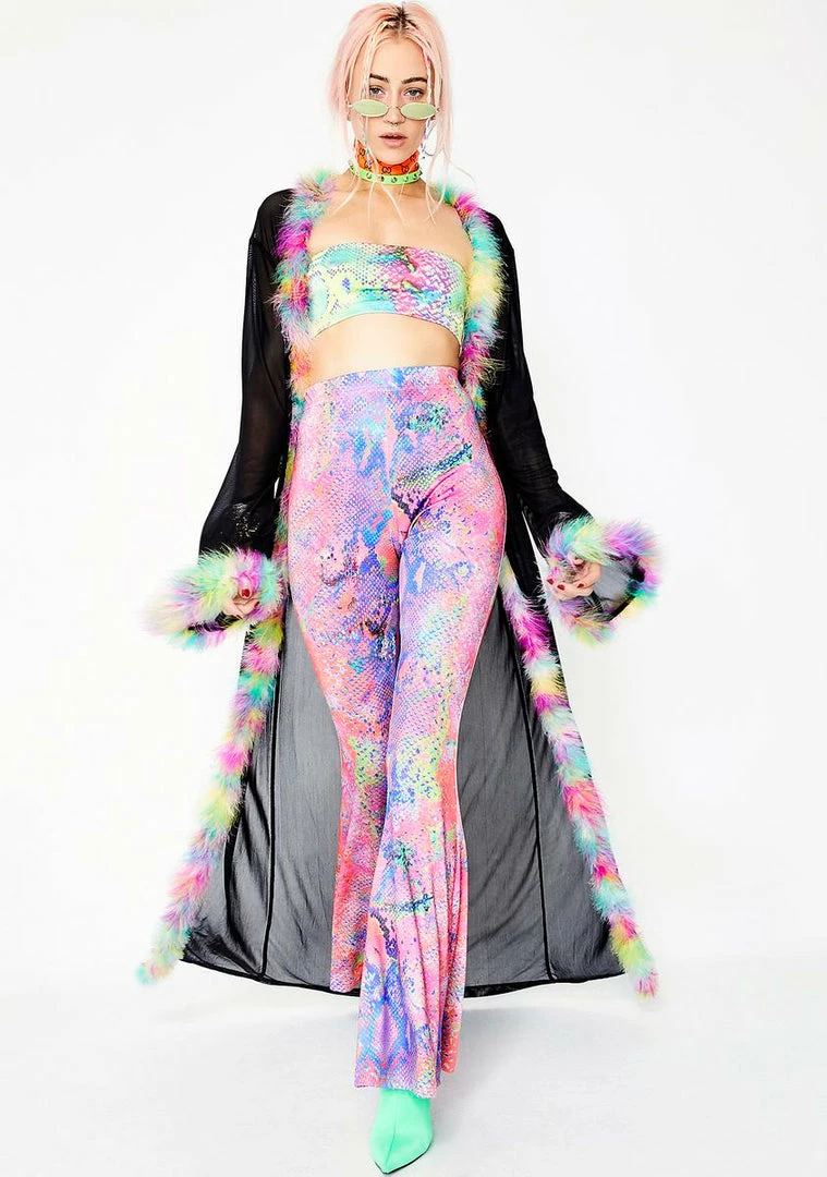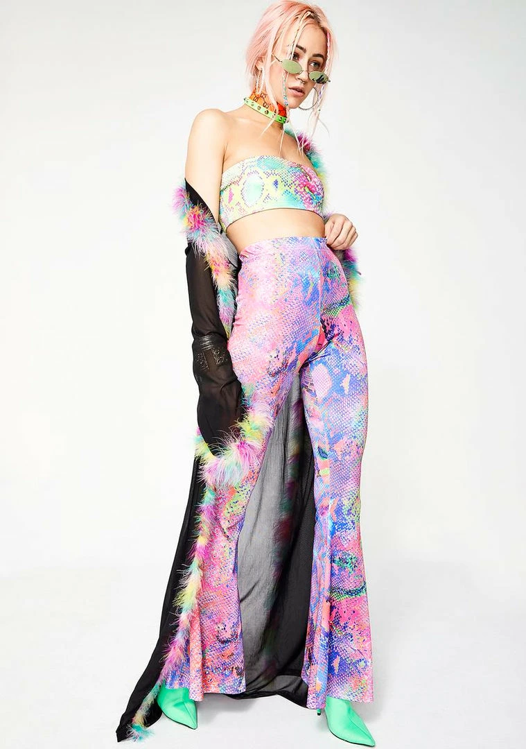 cuz youΓ’ΒΒre ready to strike. Catch ur prey with these stretchy flares that has a sikk rainbow snakeskin print all ova and an elastic waistband.