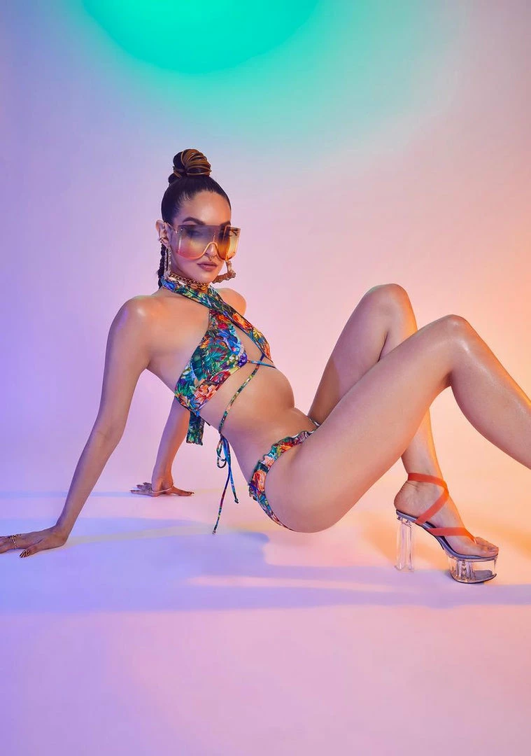 cuz the pool called. This sexy bikini top has a multi way design with adjustable tie straps, an all over tropical print, and is made from recycled materials.