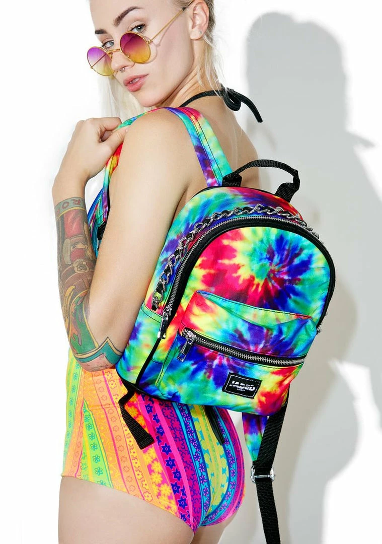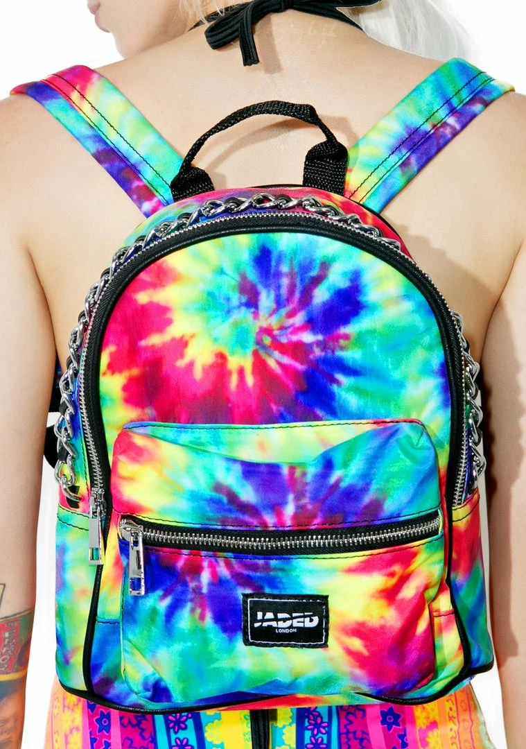 letz get waaay far out, bb. This pretty mini backpack is covered in a trippy ass vibrantly colored tie dye print and features sik chain trim, adjustable straps and top zip around closure.