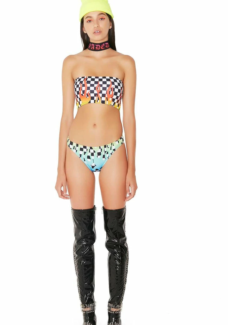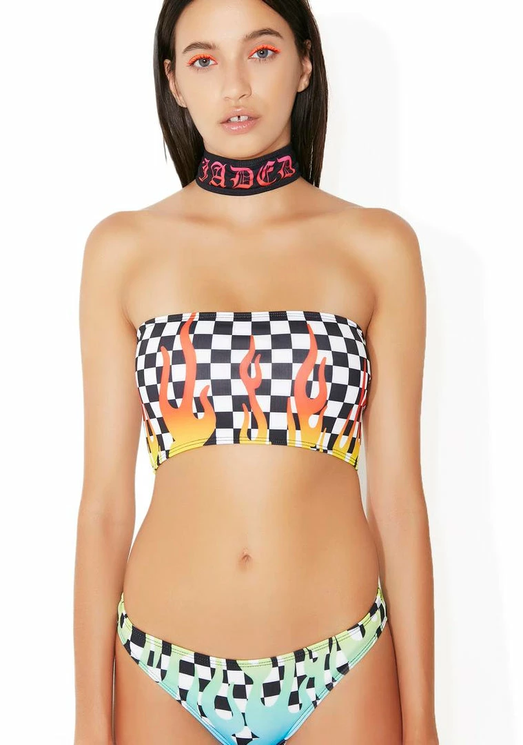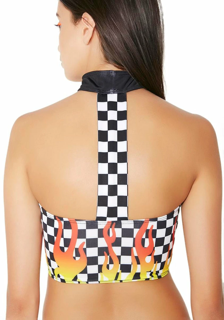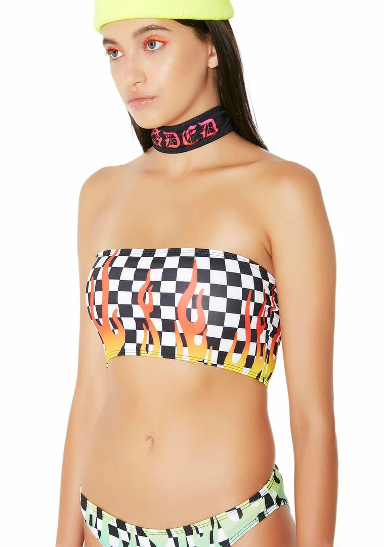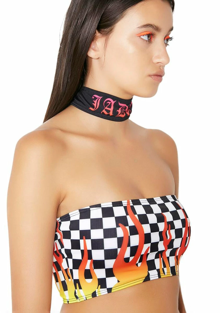 yew keep it fire all da time, bb. Bring da heat in this top that features a strapless bandeau design, a black Nรขยย white checkered print with hot af flamez cominรขยย up from da bottom, and a checkered strap goinรขยย up yer back that attaches to a black choker with pink รขยยJadedรขยย text.
