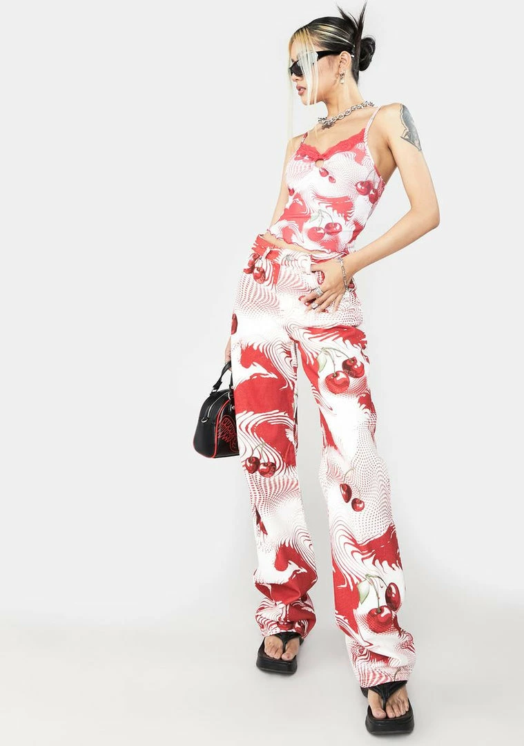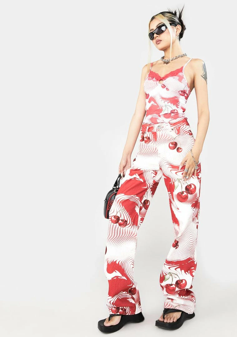 take รขยยem on a sweet trip, babe. These slouchy boyfriend jeans have a high waist fit, front and back pockets, and a trippy cherry print all over.