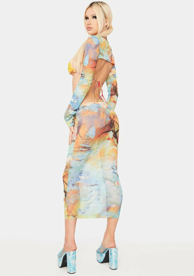 cuz you keep it juicy! This cover up maxi skirt has a mesh construction, a fruit print all over, and can be worn high or low on the waistline.