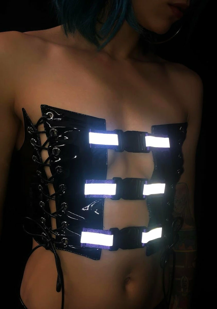 will have ya feelinΓ’ΒΒ like THAT bish! Serve some sassy sexx appeal in this lil vinyl corset that has reflective buckle closures on the front and adjustable lace-ups on the sides.