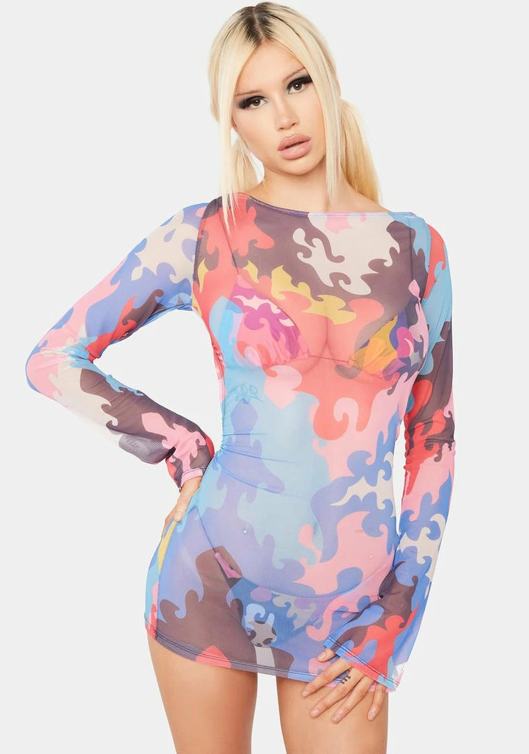 cuz it’s a wild time! This long sleeve mesh cover up dress has an open back, adjustable straps, and a bright western print all over.