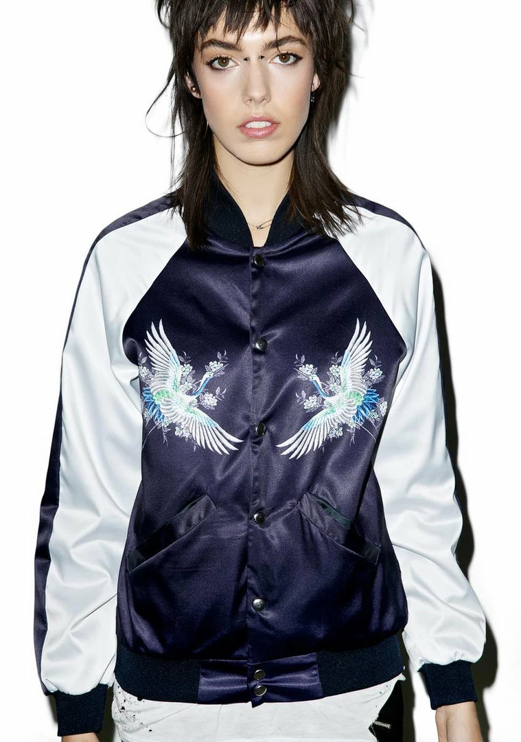 …youΓ’ΒΒre full of grace, babe. This dope satin souvenir jacket features a gorgeous navy blue Γ’ΒΒN white construction, contrasting sleeves with stripes down the side, ribbed trim, side pockets, button snap front closure, and amazingly crane and flower embroidery across the back and chest.