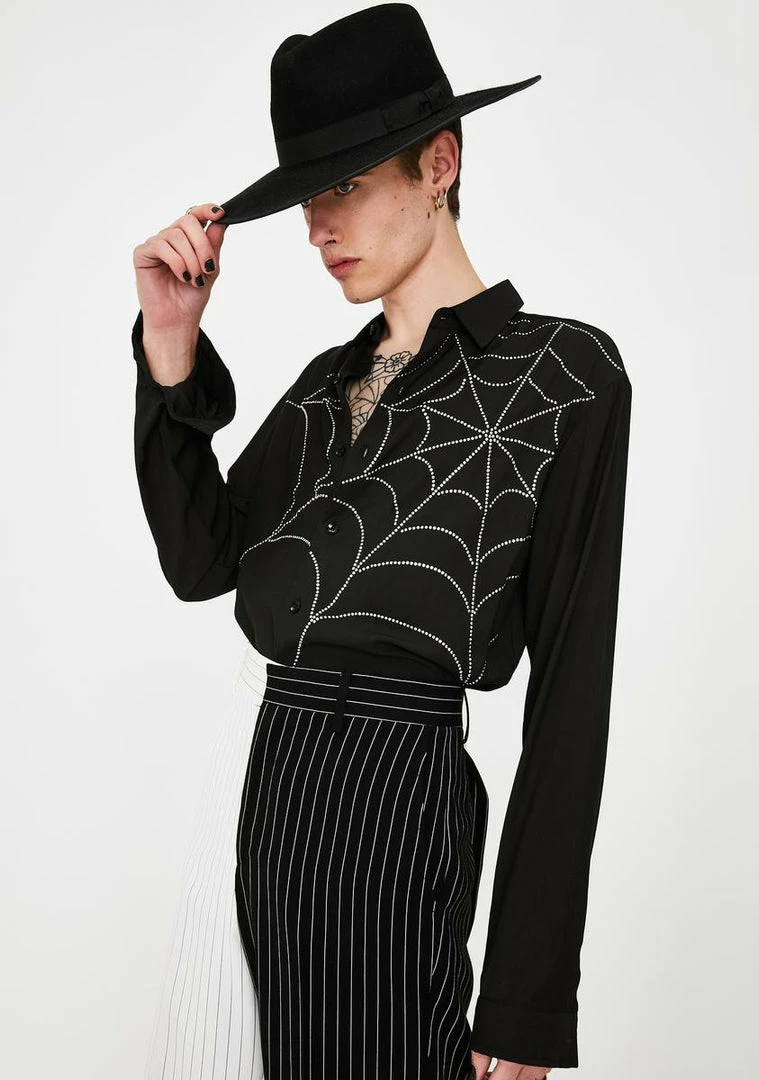 give รขยยem spooky vibez. You got a dark soul in this long sleeve shirt that has button up closures, a relaxed fit Nรขยย a rhinestone spiderweb design on the front.