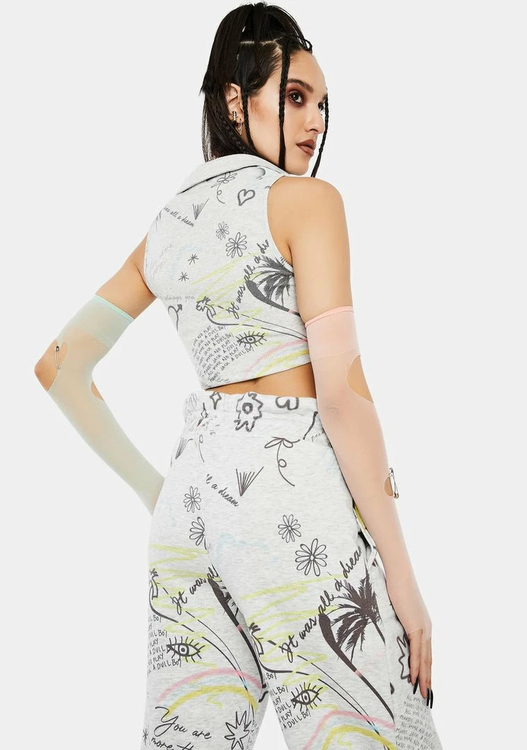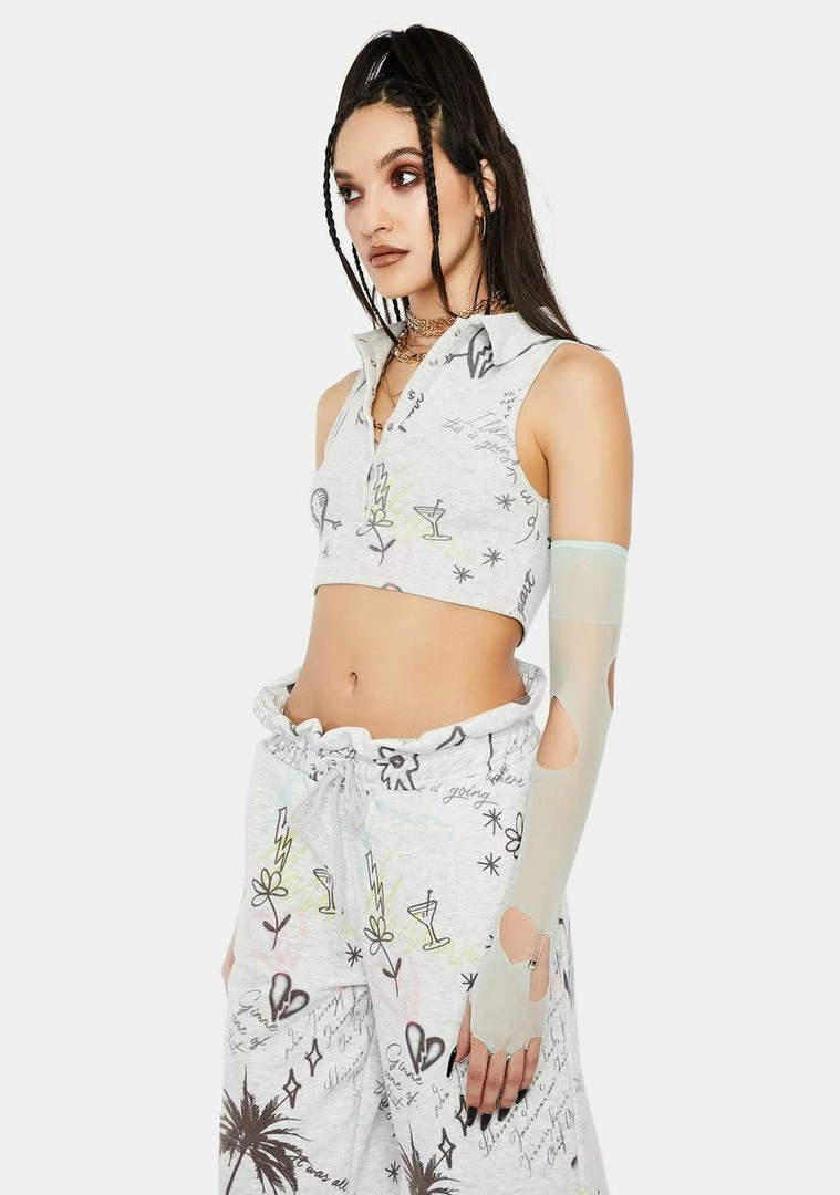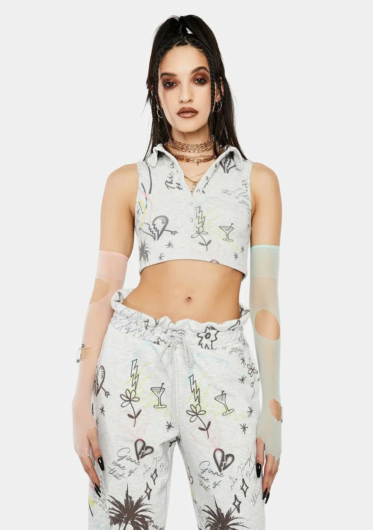 cuz youΓ’ΒΒre passing love notes. This ribbed knit halter top has a collared neckline with snap button closures, a doodle graffiti print all over, and a cropped fit.