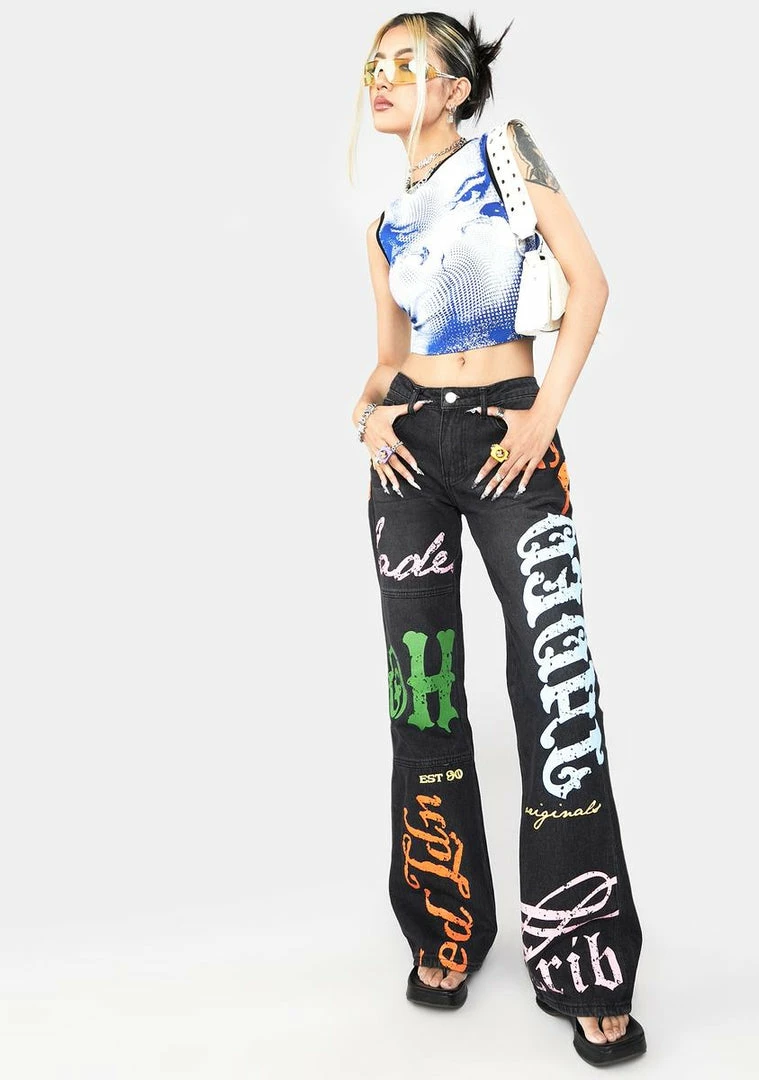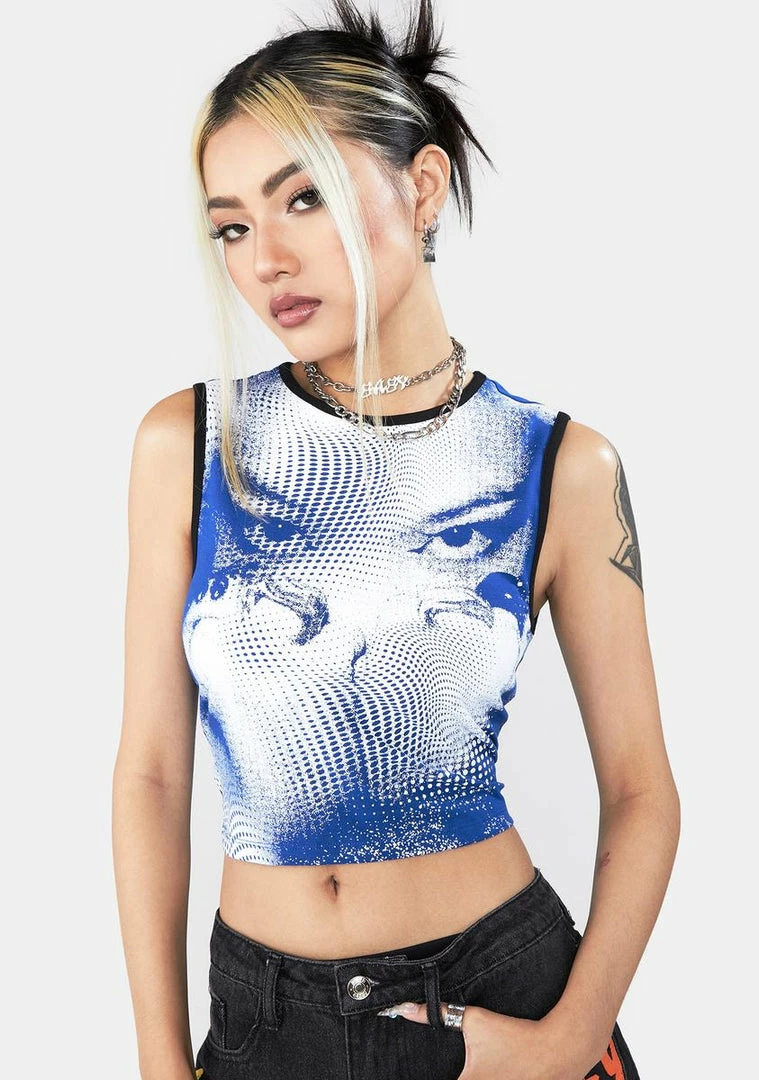 cuz you don’t want no scrub! This tank top has a cropped fit, a solid blue back, and a y2k dotted face print on the front.