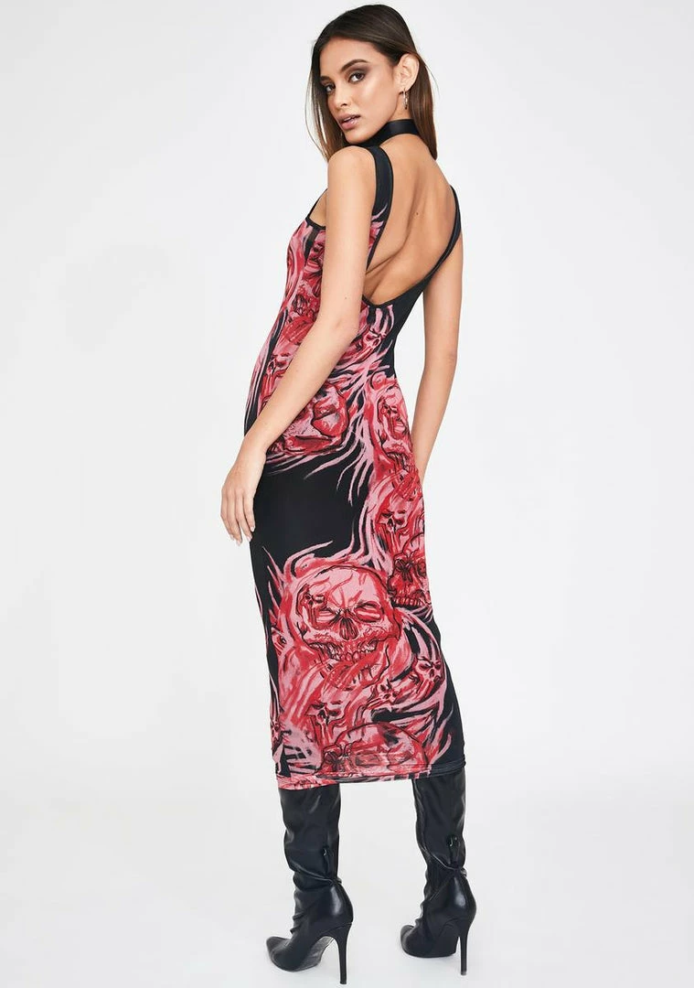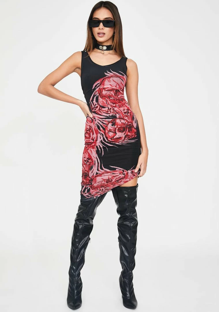 cuz youΓ’ΒΒre a total badazz. This double layered mesh midi dress has a bodycon fit and a flaminΓ’ΒΒ hott skull print all ova.