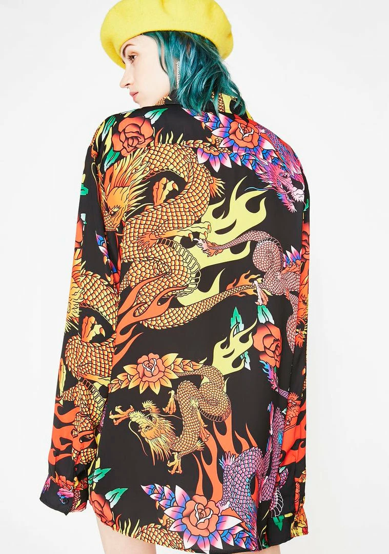 cuz your style is always on fire babe! Level up to full slay mode in this button up shirt that has a oversized fit, a dragon print all ova, and a comfy lightweight material.