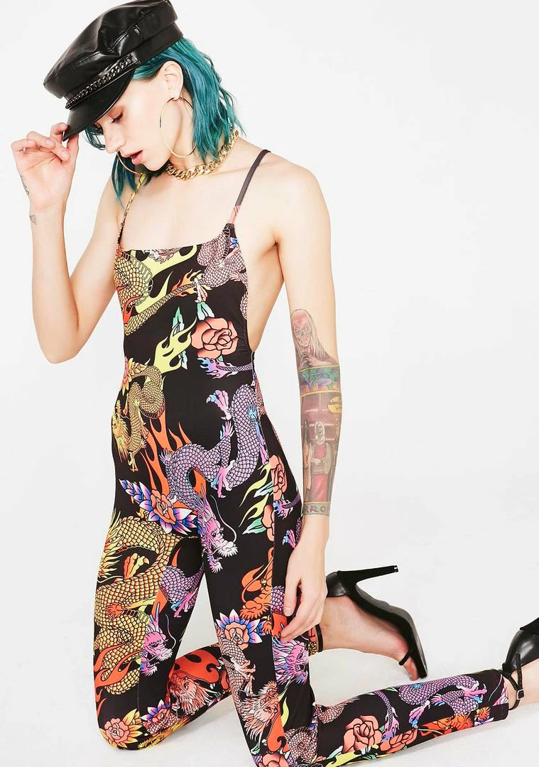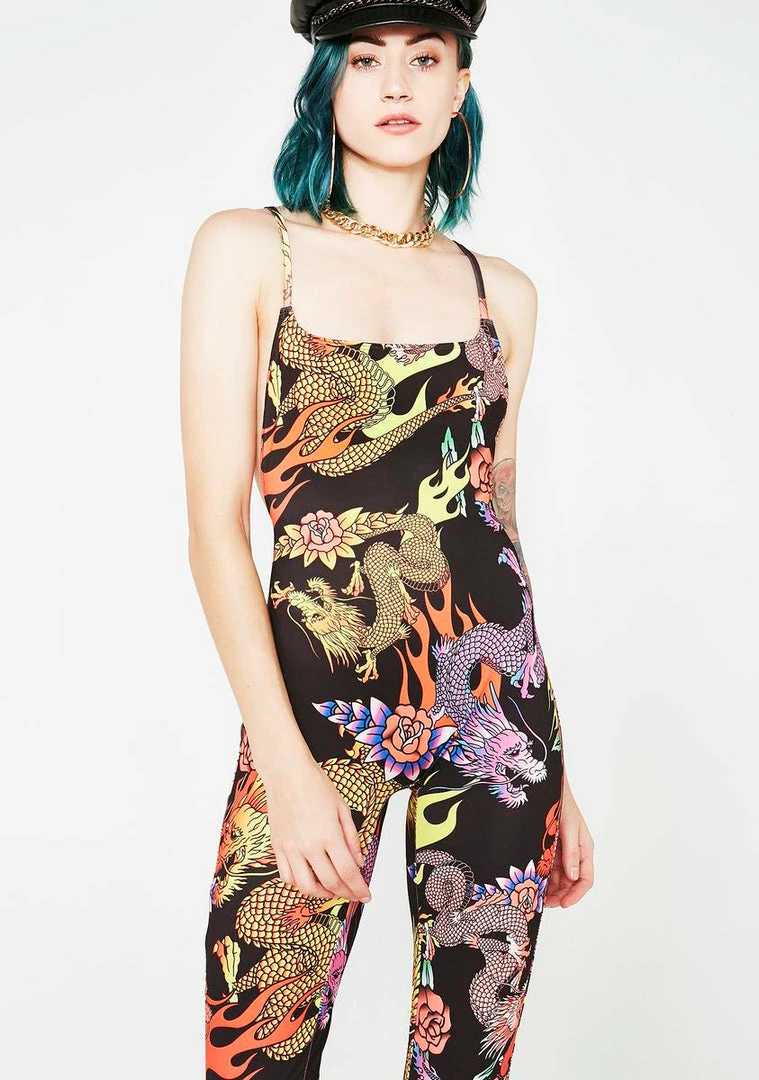 cuz your style is always on fire babe! Level up to full slay mode in this sexxy dragon print catsuit that has a square neckline, skinny cross back straps, and a bodycon fit.