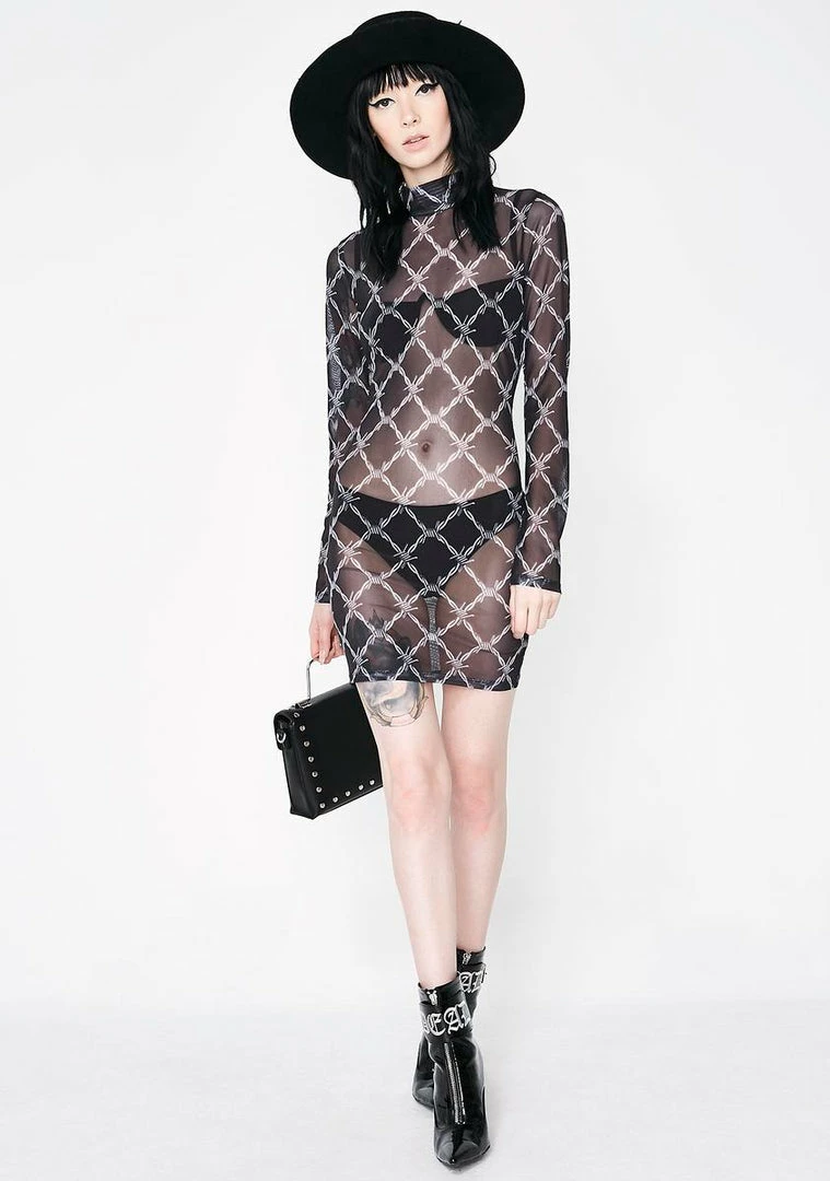 cuz youΓ’ΒΒre sharp to the touch babe. They betta beware in this dope sheer mini dress that has a barbwire print all ova, a mock neck and long sleeves.