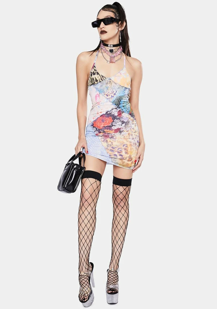 cuz lifeΓ’ΒΒs a game and youΓ’ΒΒre winning. This mini cami dress has a halter neckline, adjustable tie closures, and a mixed patchwork animal print all over.