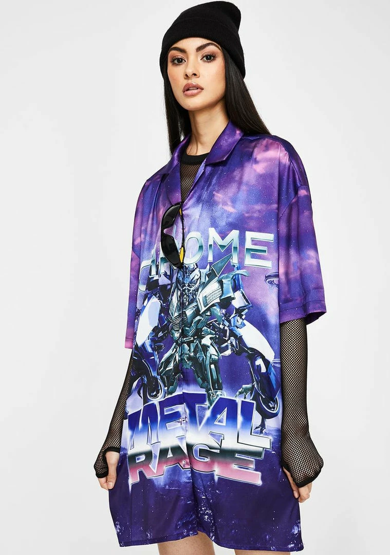 got ya ready for the cyber war! Lead รขยยem to dystopia in this oversized button up shirt dress that has a silky satin construction, a revere collar Nรขยย a robotic print all ova.