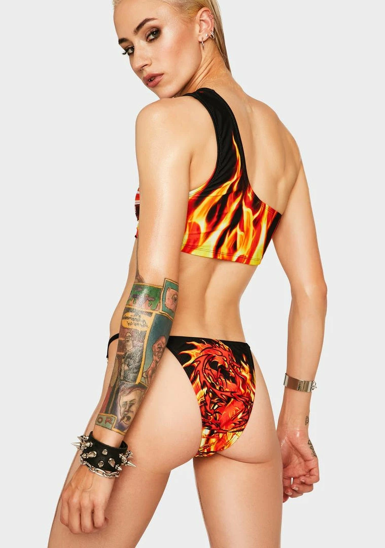 will turn up the heat! These flaminΓ’ΒΒ hot bikini bottoms have a high leg cut, O-ring details, and an all over flame & racecar print.
