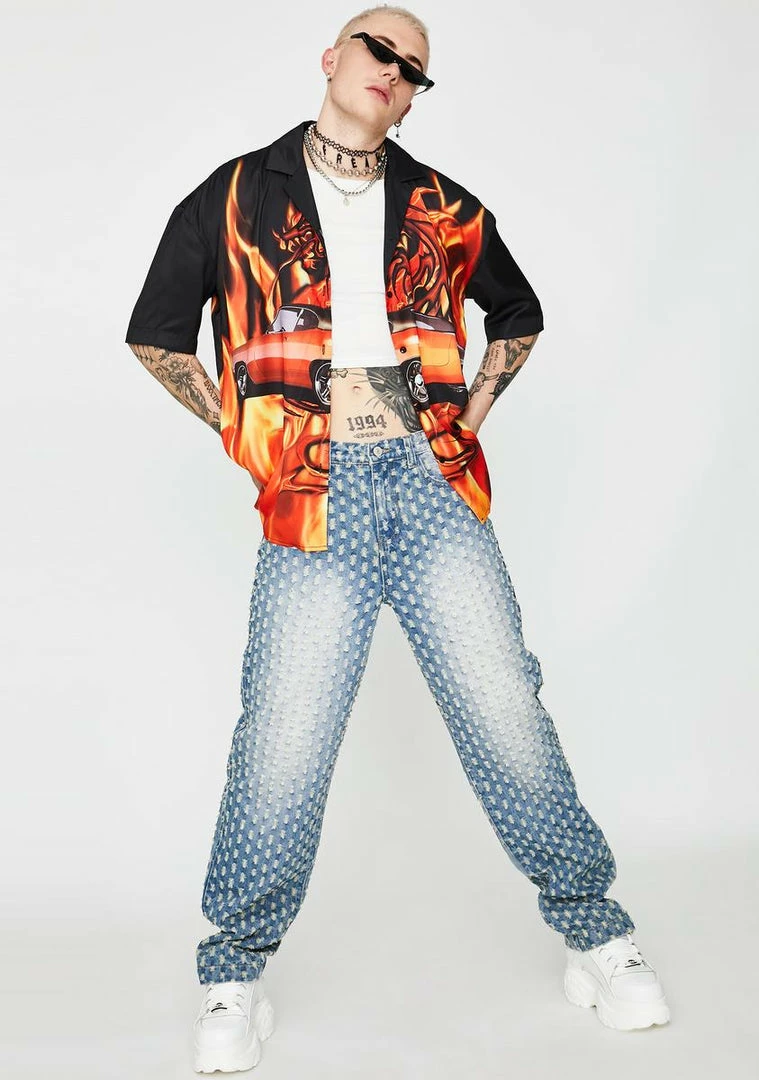 will have ya riding straight to hell, babe! Bring the heat in this button up shirt that has a revere collar, short sleeves Nรขยย a dragon flame print all ova.