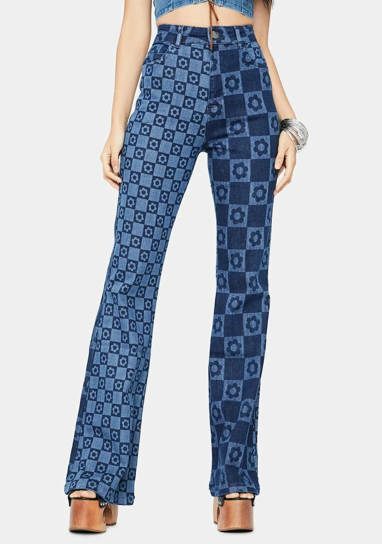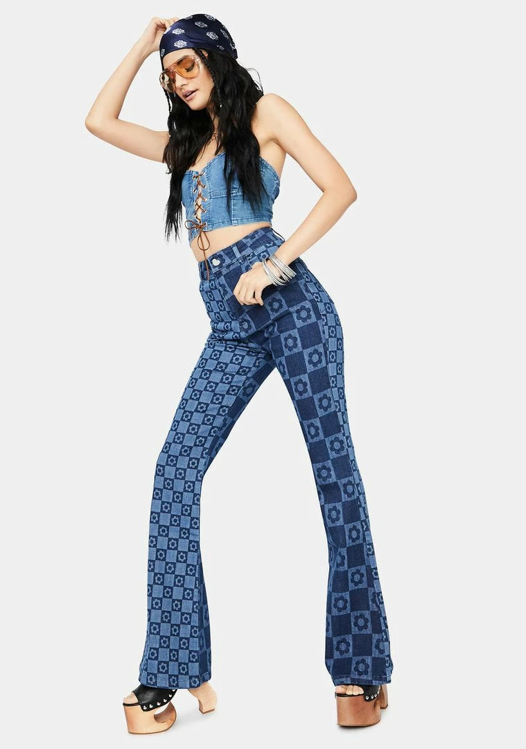 cuz youΓ’ΒΒre a groovy queen! These flared denim jeans have a high waist fit, a heart shaped button closure, pockets on the back and a retro flower print all over.