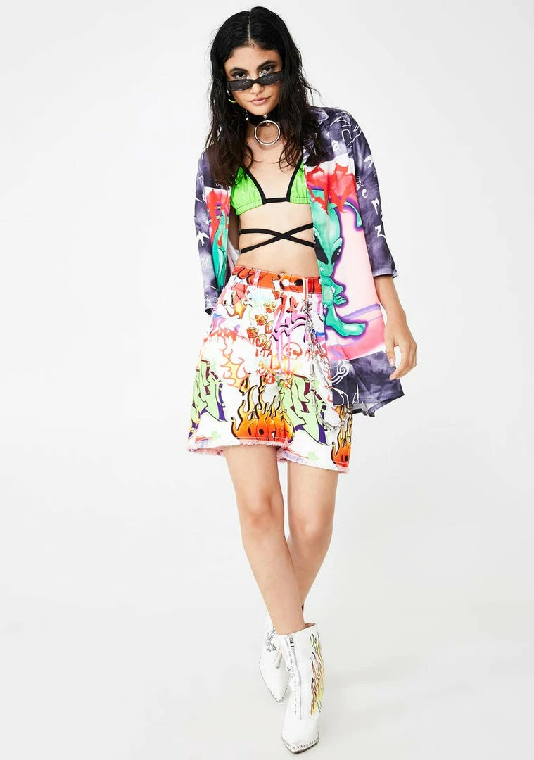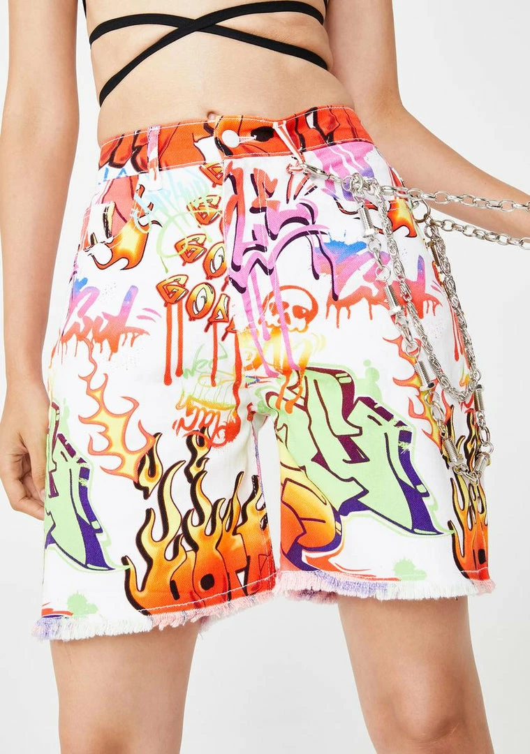 cuz youâre a work of art, babe! Paint the town in these wide leg denim shorts that have a high waist fit, front Nâ back pockets, frayed hems and a graffiti print all ova.