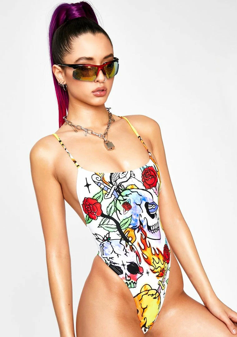 cuz youΓ’ΒΒre insane in the membrane! Start a riot in this square neck cami swimsuit with a high leg cut and a rainbow graffiti skull print all ova.