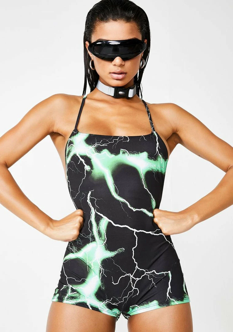 cuz you slay in rain or shine, bish! Strike like lightning in this supa fly lil romper that has a square neckline and cheeky fit, crossback straps, and green lightning graphics all ova!