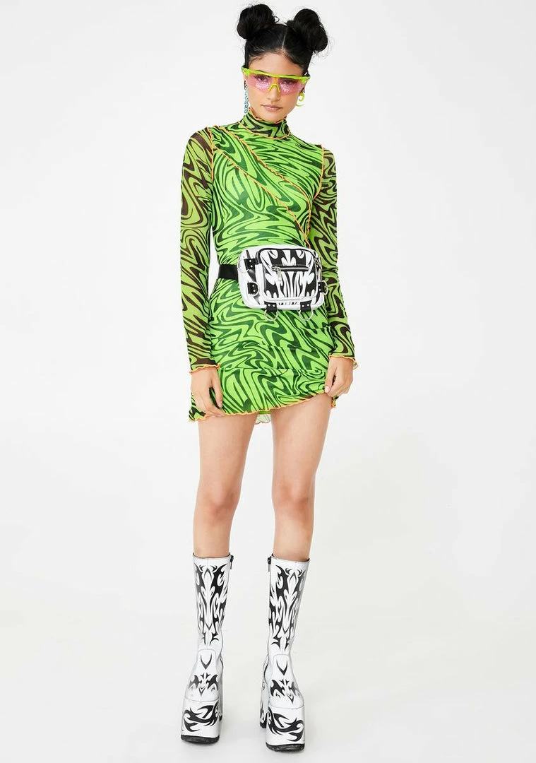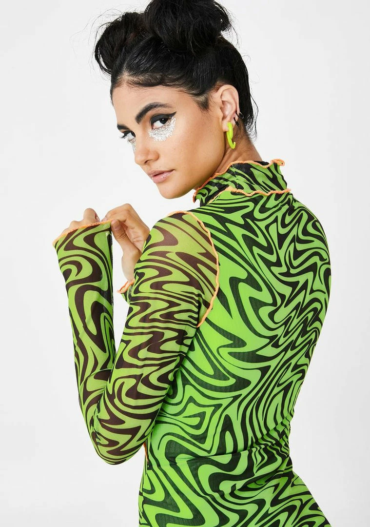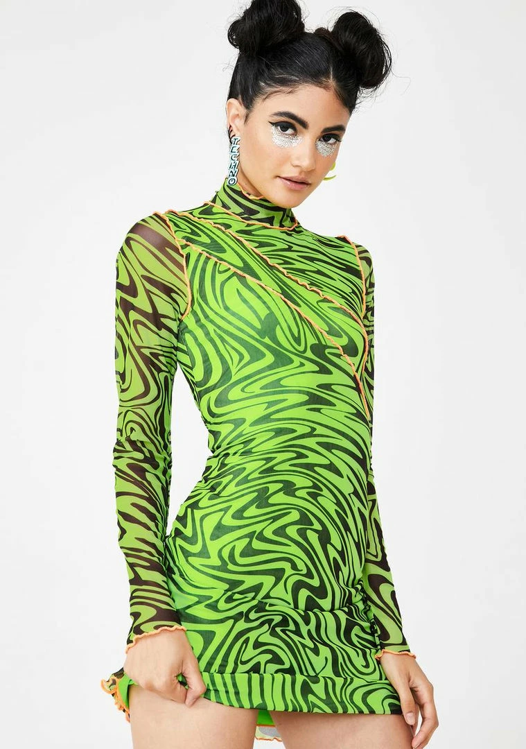 cuz youΓ’ΒΒre an acid candy queen. Take Γ’ΒΒem higher in this long sleeve mesh dress that has a mock neckline, neon orange lettuce-edge trim, and a trippy swirl print all ova.