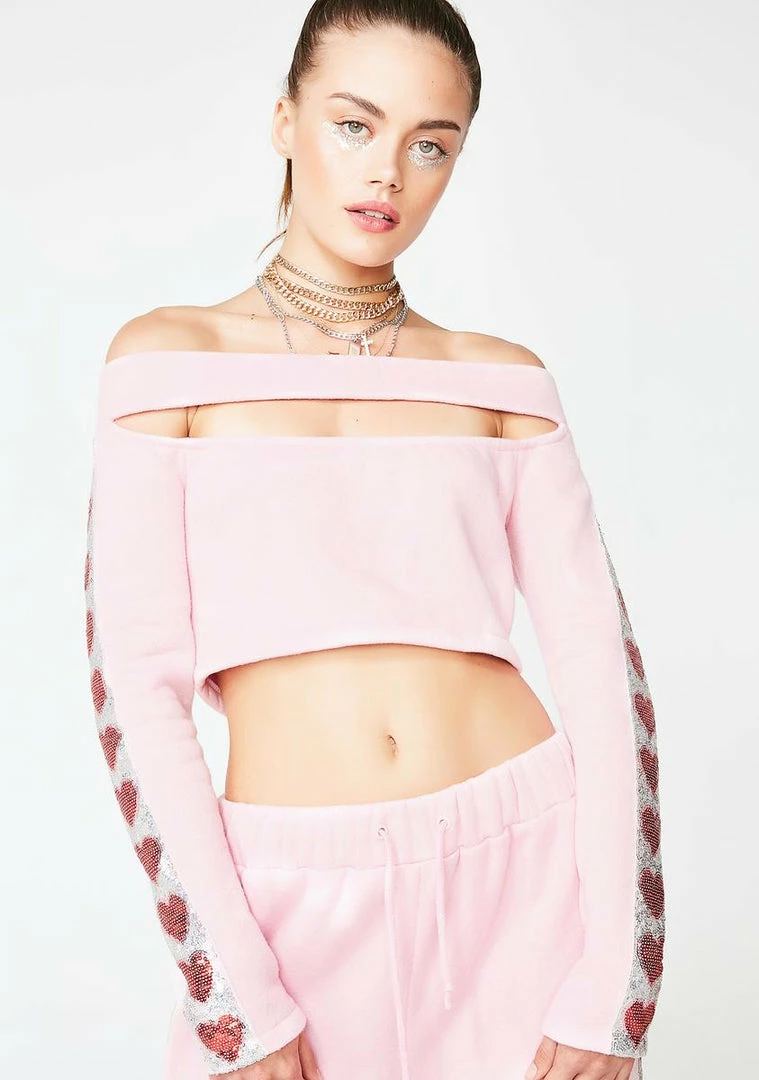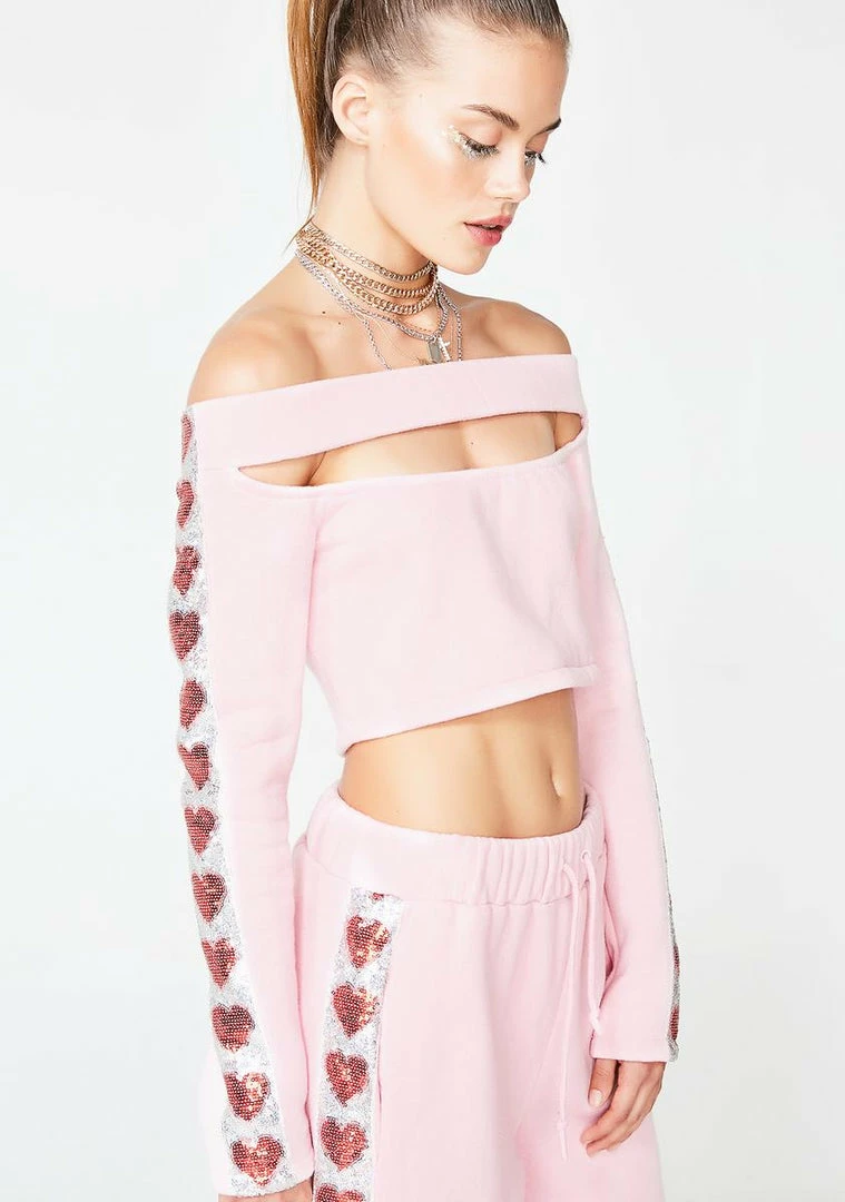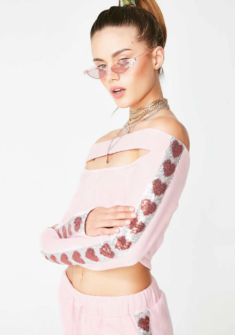 cuz ya no gym junkie. Look rad AF in this cold shoulder top that has cut-out deetz, sequin heart deetz on the sleeves, and a back zip closure.