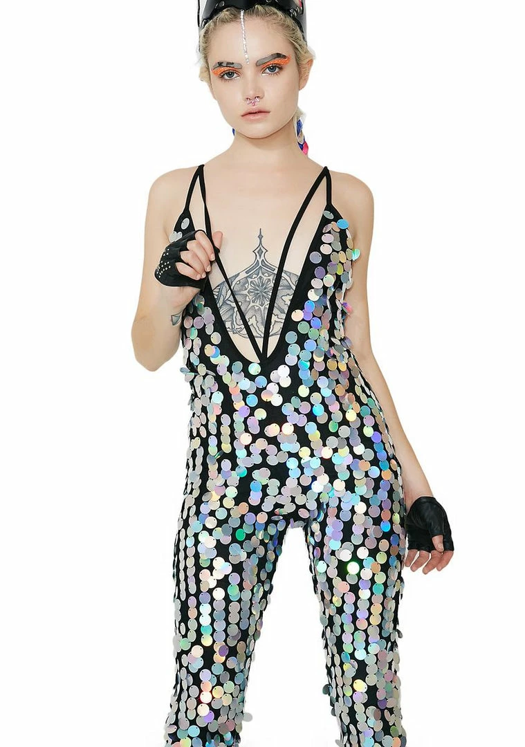 they got nothinΓ’ΒΒ on yer epic level of sparkle! This catsuit has a stretchy fit, allover holographic sequins and adjustable straps.
