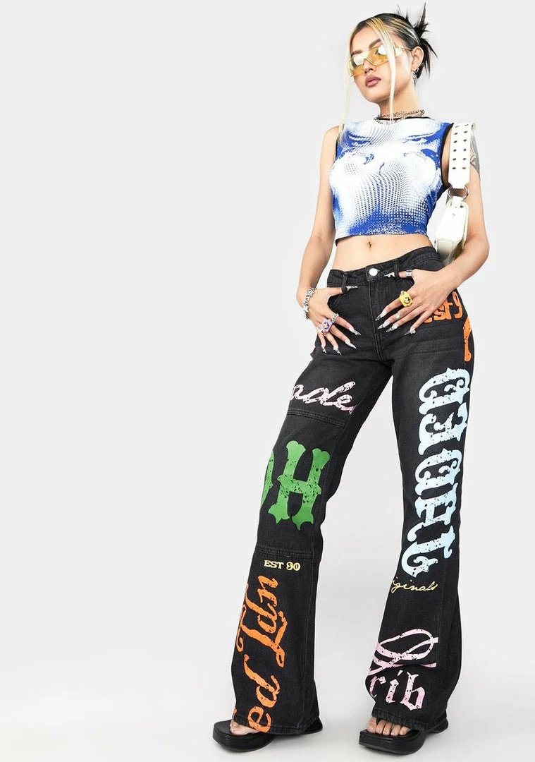 cuz you’re sweeter than the beat. These low rise denim jeans have a relaxed fit, front and back pockets, and y2k font placement prints all over.