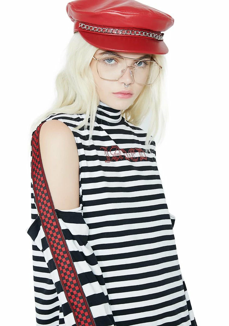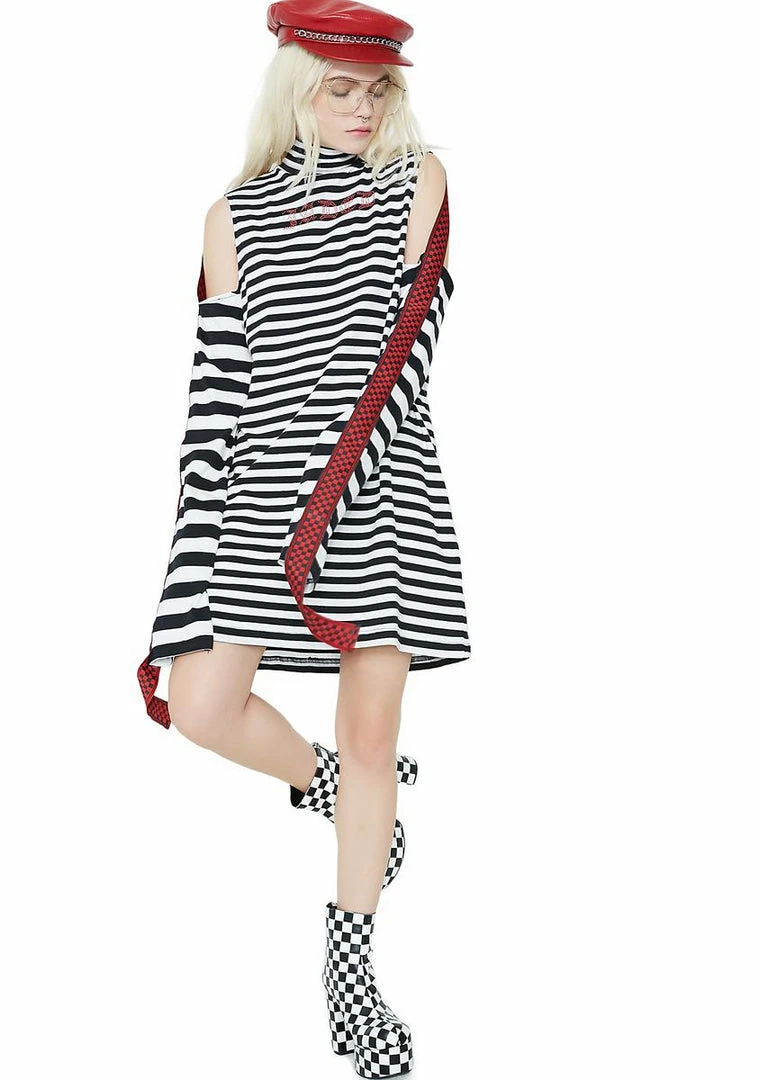 cuz you can be fashionable and comfy at the same time, duh! This striped turtleneck shirt dress has cold shoulder details with checkered stripes down the sleeves.