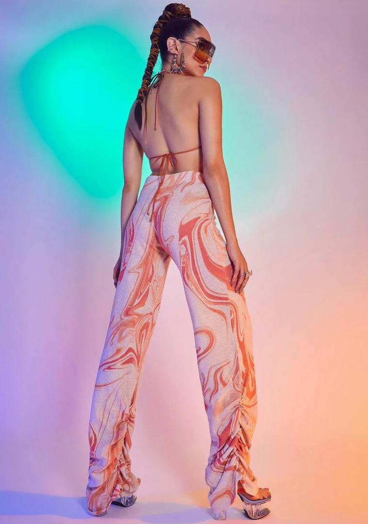 give ’em psychedelic sass! These wide leg knit joggers have an elastic waistband, ruched hems, and a tonal swirl print all over.