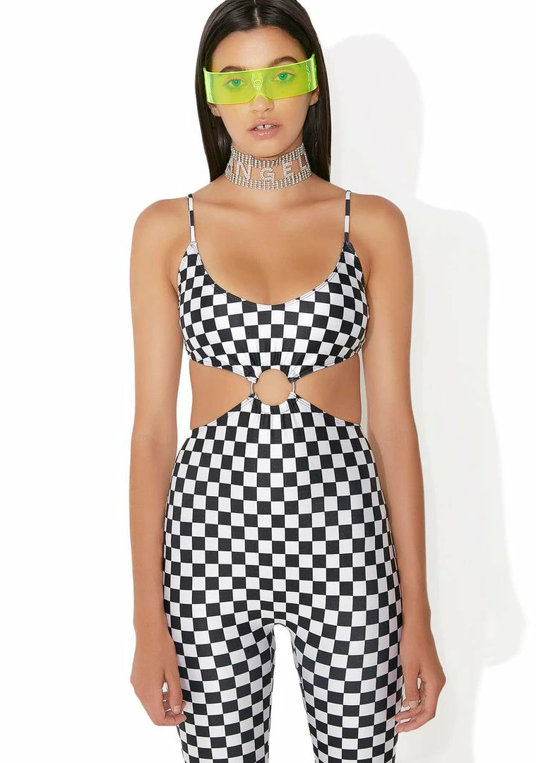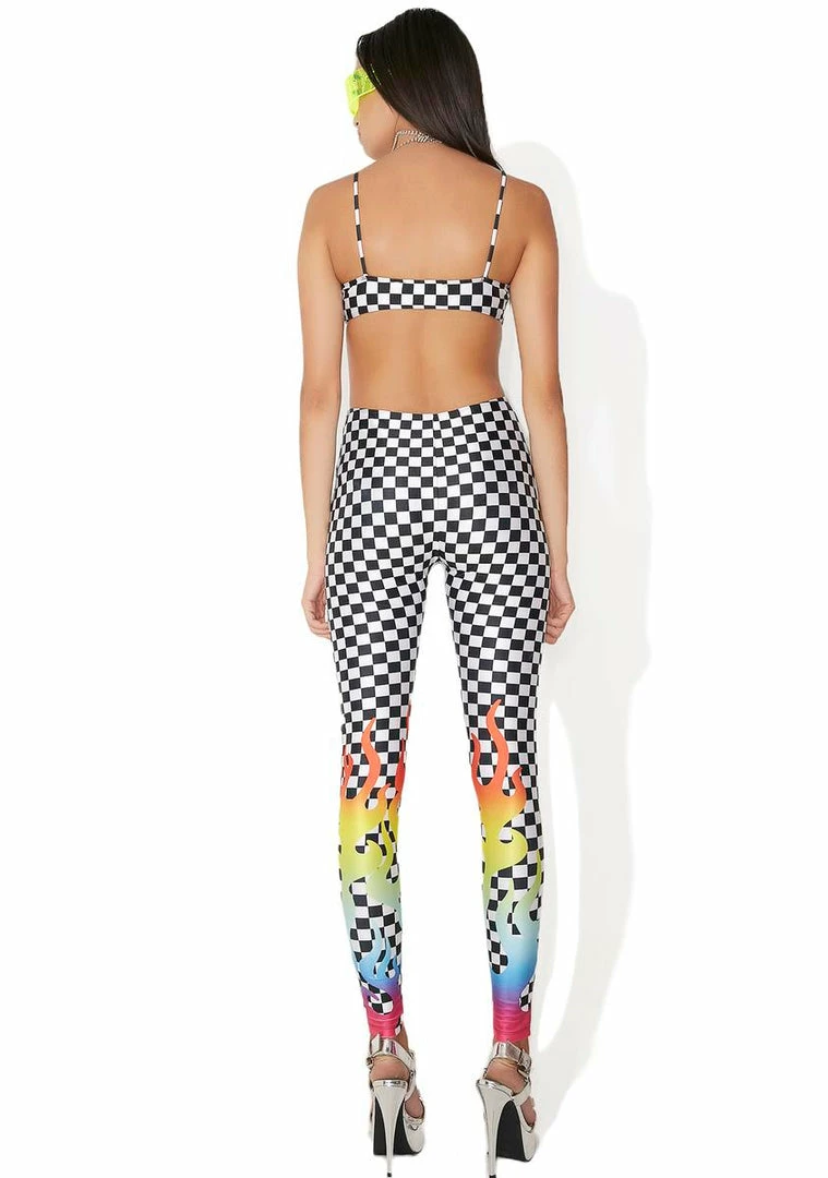 you canât start a fire without a spark, babe…Create a technicolor heat wave in this sikk catsuit featuring a stretchy Nâ curve-hugginâ fit, checkerboard print top, rainbow flames coming up the legs, cut-out front and back with O-ring connector and plunging neckline.