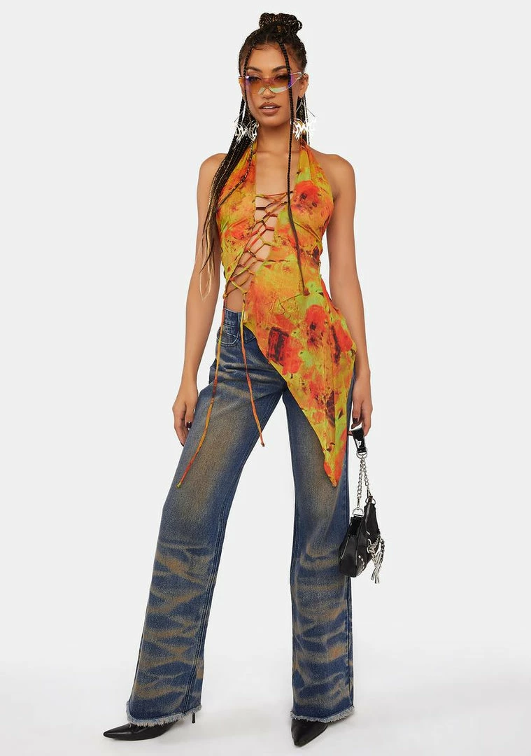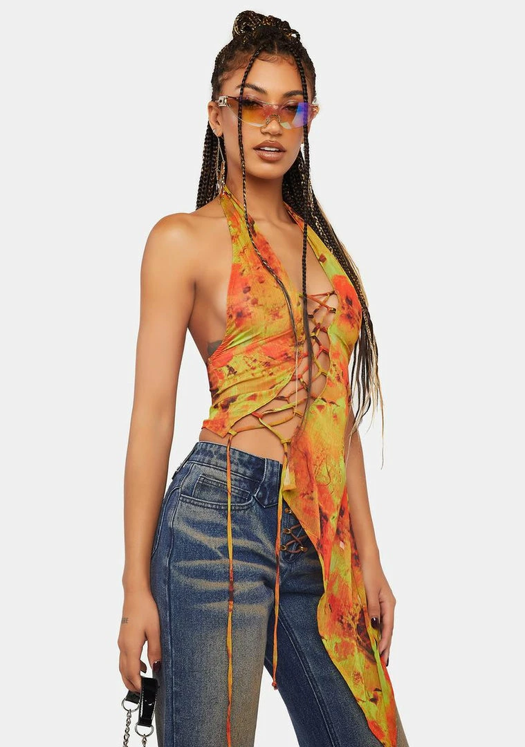 cuz you’re not short on attitude. This sleeveless top has a sulfur spring print all over, a two-way stretch construction, a cutout at front with lace-up ties, adjustable halter ties, and an asymmetrical hem.