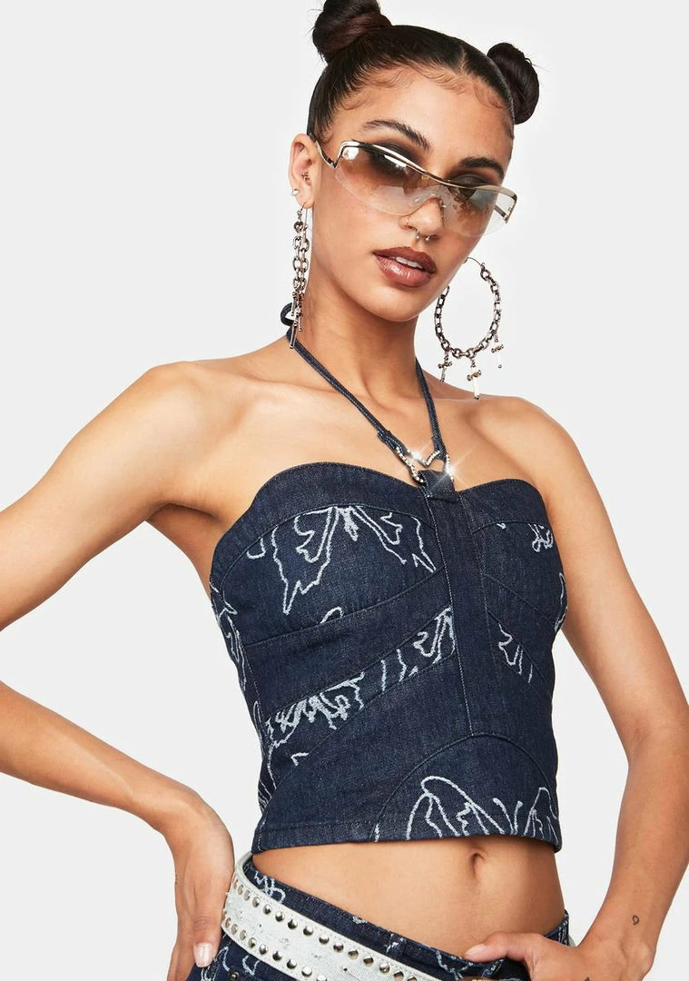 will give you more than fifteen minutes of fame! This corset crop top has a paneled denim construction, adjustable halter neck ties with a rhinestone butterfly detail, a back zip closure, and a butterfly print all over.