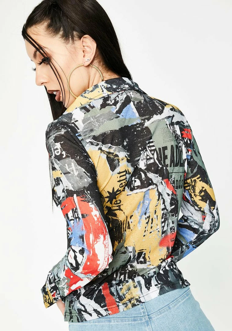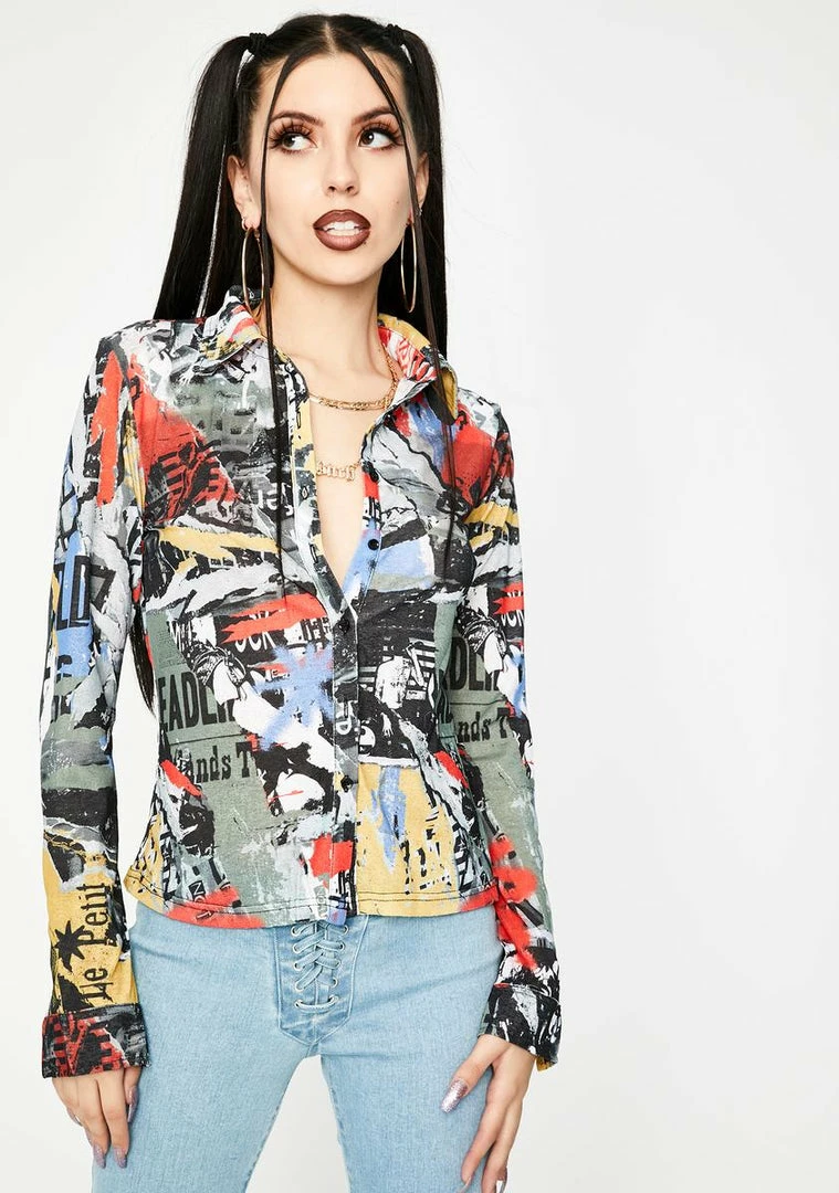 read all about it, babe! YouΓ’ΒΒre the baddest chick on the block in this long sleeve button up shirt with a slim fit and a ripped magazine print all ova.