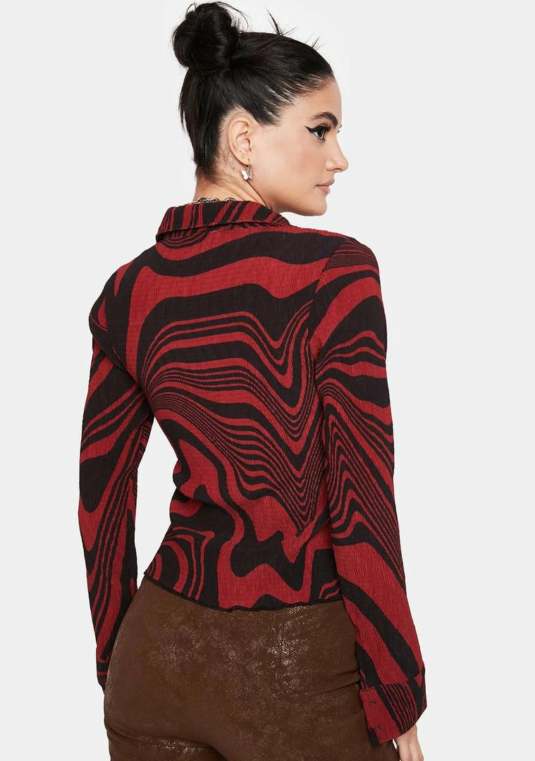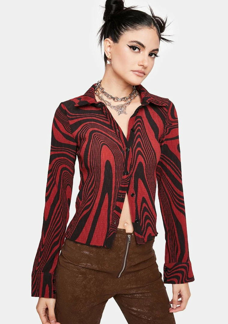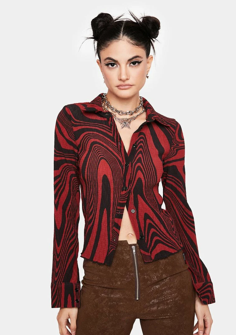 cuz you’re goin’ wild, babe. This 90’s fitted plisse shirt has a swirl print all over, button up closures, long sleeves, and a collar detail.
