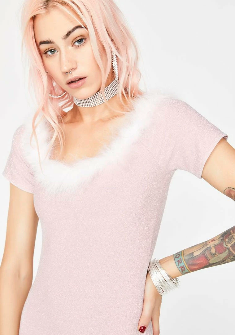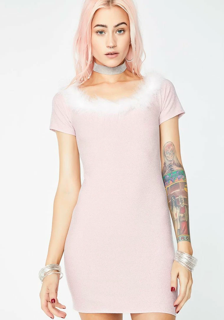 will have emΓ’ΒΒ lookinΓ’ΒΒ for sure! Wink at emΓ’ΒΒ with this off the shoulder sparkly mini dress that has a cute af feather trim.