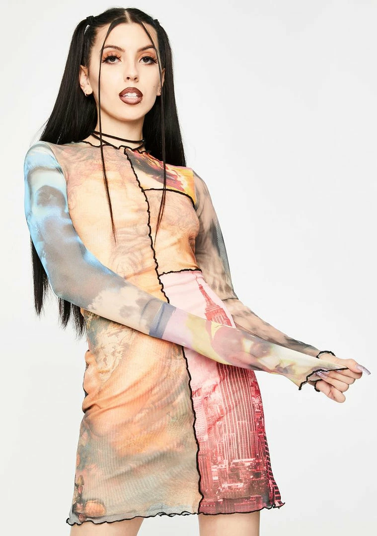 cuz youΓ’ΒΒre a classic beauty. Stun them in their trackz with this long sleeve mesh mini dress that has contrast lettuce edge seams and a panelled design with a mash up vintage print all ova.