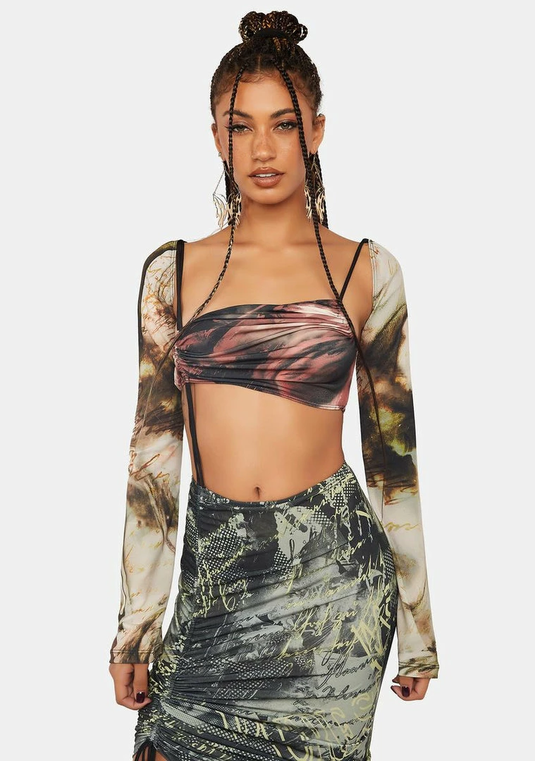 got you daydreamin’ about yourself. This long sleeve midi dress has an abstract grunge print all over, gathered channel seams with cinched ties, a waist cutout, and a bodycon fit.